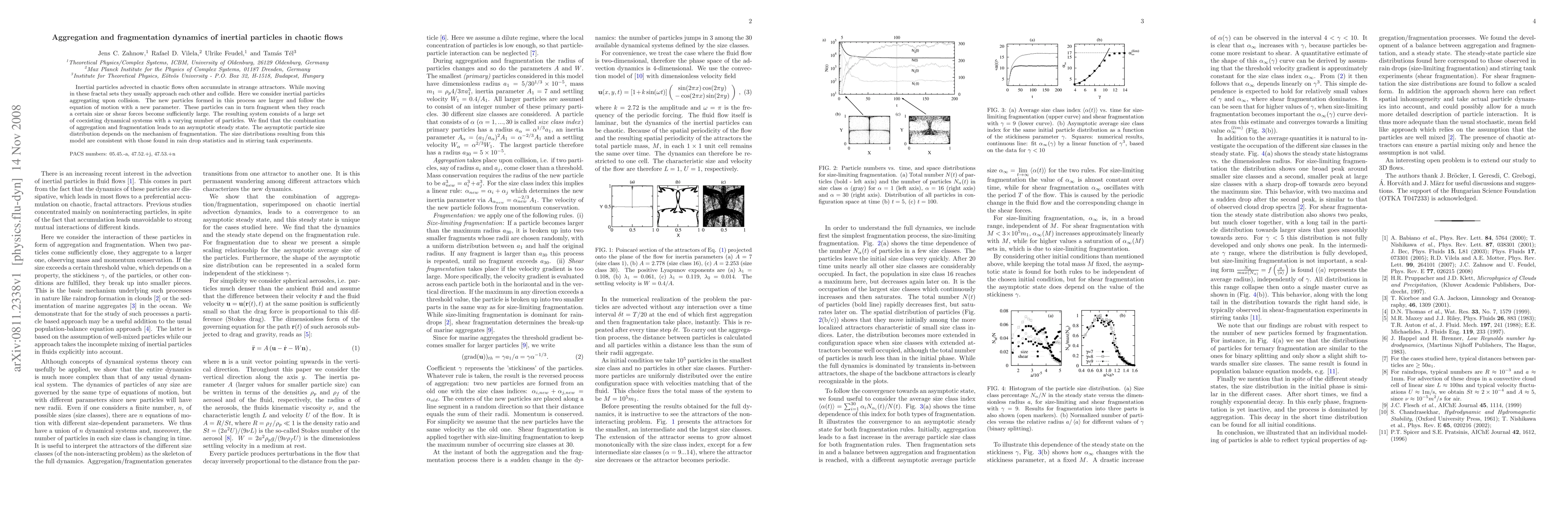 This study explores the dynamics of inertial particles in chaotic flows, focusing on their aggregation upon collision and subsequent fragmentation. The system reaches an asymptotic steady state where the particle size distribution aligns with observed distributions in natural phenomena like raindrop formation.