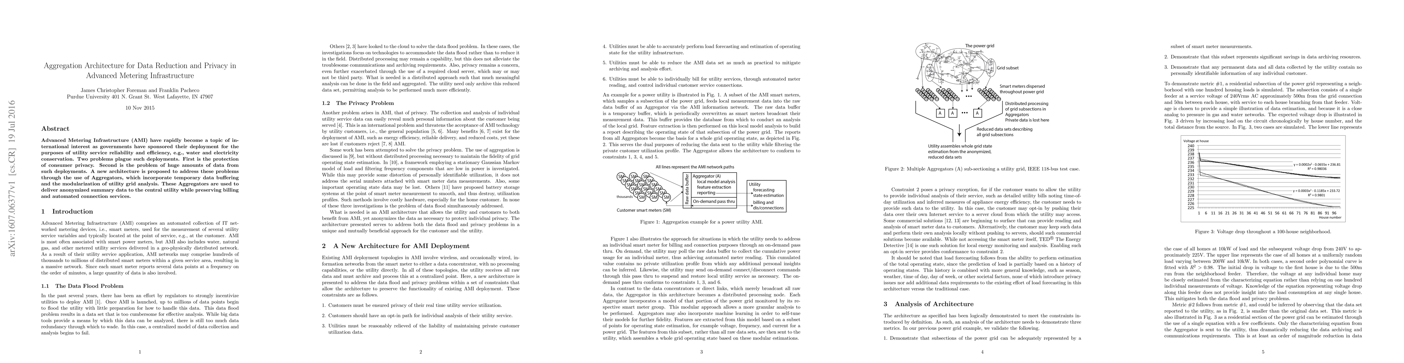 This paper proposes an Aggregation Architecture for Advanced Metering Infrastructure (AMI) to tackle privacy concerns and data volume issues. It introduces Aggregators that buffer data temporarily and modularize grid analysis, delivering anonymized summaries to utilities while maintaining billing and connection services.