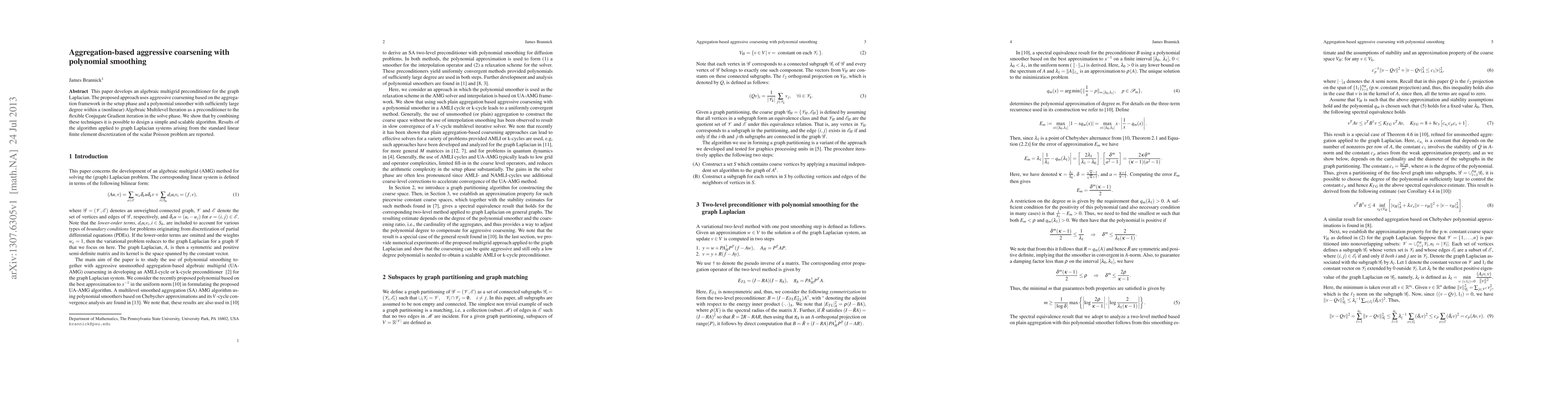 The paper develops an algebraic multigrid preconditioner for the graph Laplacian, using aggressive coarsening based on aggregation and a polynomial smoother within a nonlinear Algebraic Multilevel Iteration.