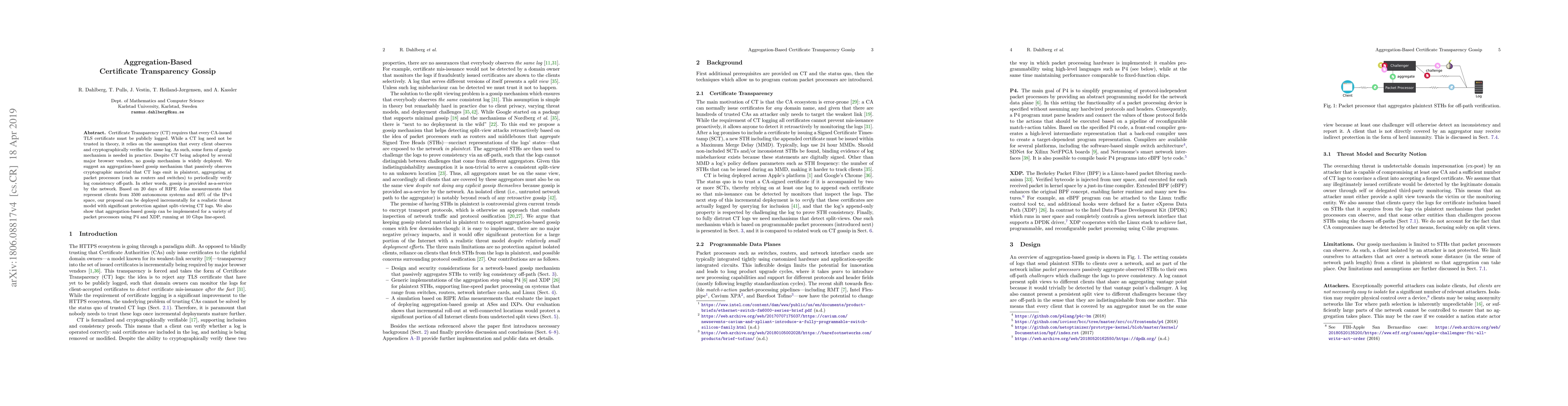 This paper proposes an aggregation-based gossip mechanism to ensure consistency of Certificate Transparency logs by having packet processors like routers and switches verify log integrity off-path. The method is shown to be deployable incrementally and can provide significant protection against split-viewing attacks, based on 20 days of RIPE Atlas measurements.