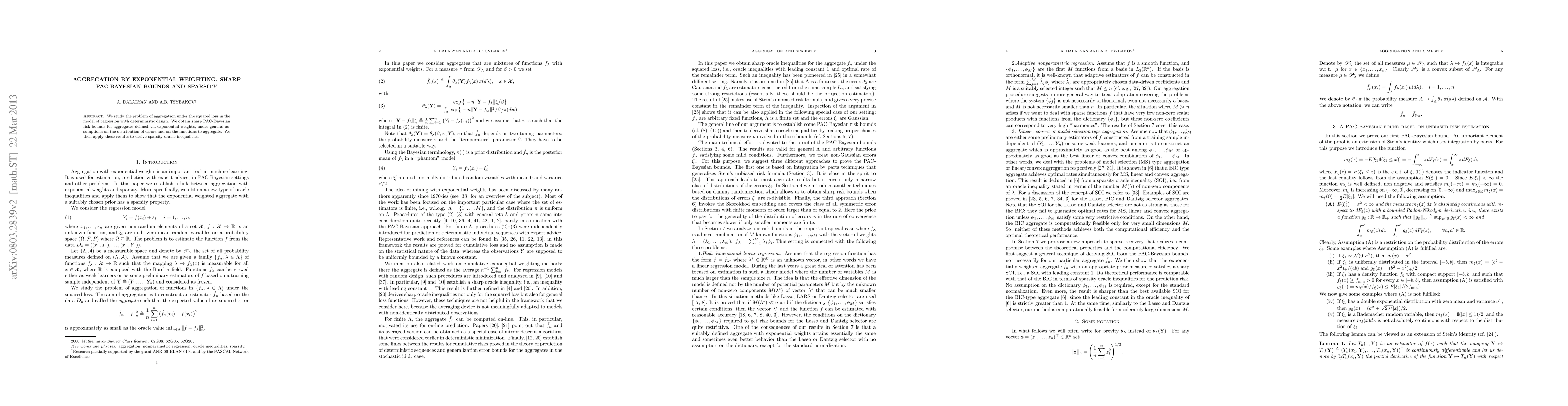 We study the problem of aggregation under the squared loss in the model of regression with deterministic design. We obtain sharp PAC-Bayesian risk bounds for aggregates defined via exponential weights, under general assumptions on the distribution of errors and on the functions to aggregate. We then apply these results to derive sparsity oracle inequalities.