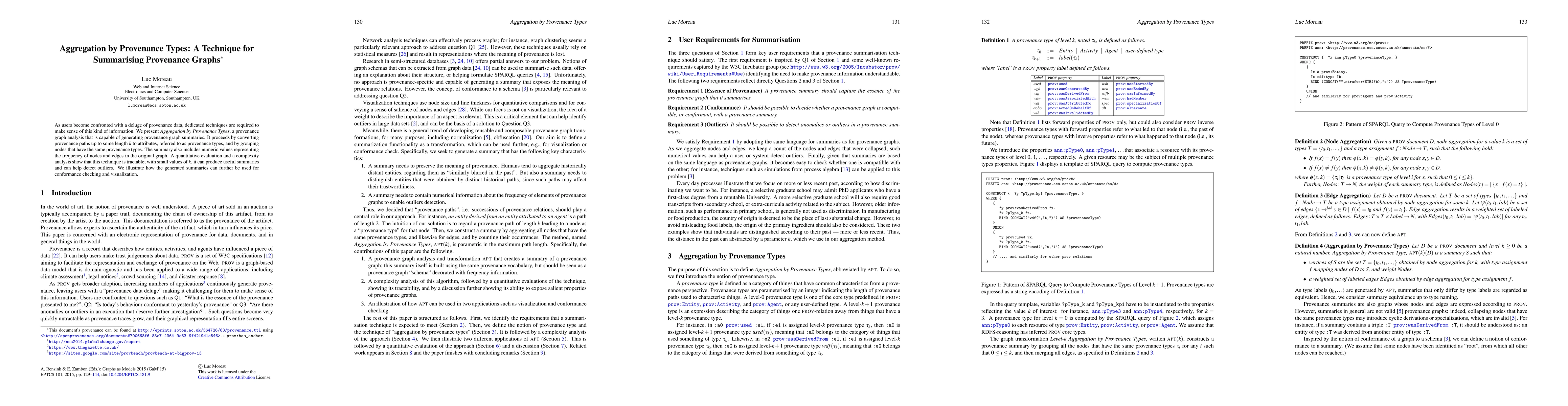 The paper introduces Aggregation by Provenance Types, a method for summarizing large provenance graphs by converting paths into attributes and grouping similar nodes, providing frequency data for nodes and edges. The technique is shown to be effective and practical, aiding in detecting outliers and supporting conformance checking and visualization.
