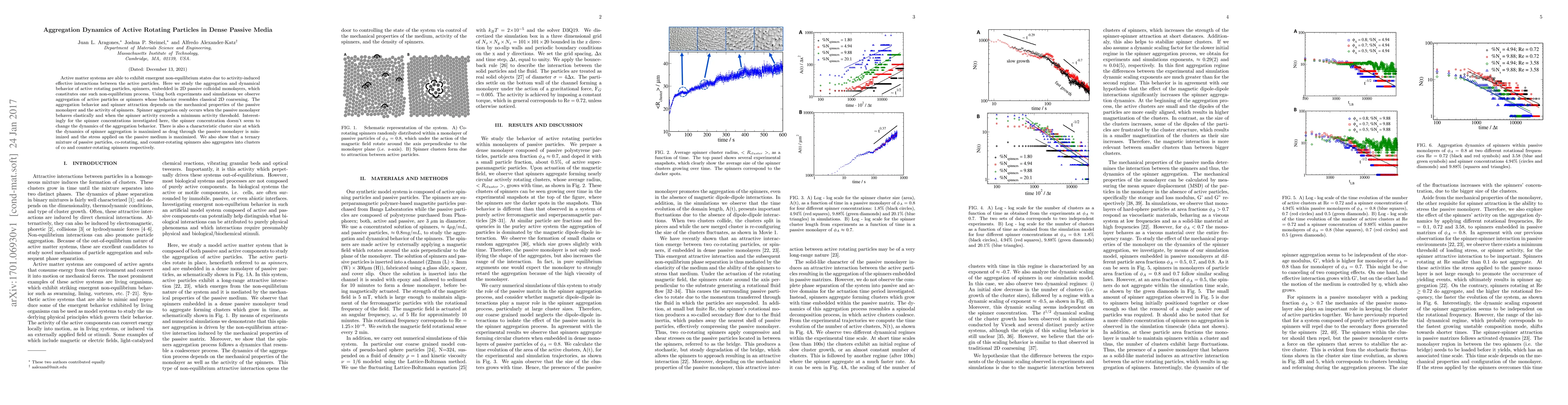 This paper investigates the aggregation dynamics of active rotating particles (spinners) in dense passive colloidal monolayers, revealing that spinner aggregation occurs when the passive medium is elastic and spinner activity surpasses a threshold. The study finds a characteristic cluster size that maximizes spinner aggregation dynamics.