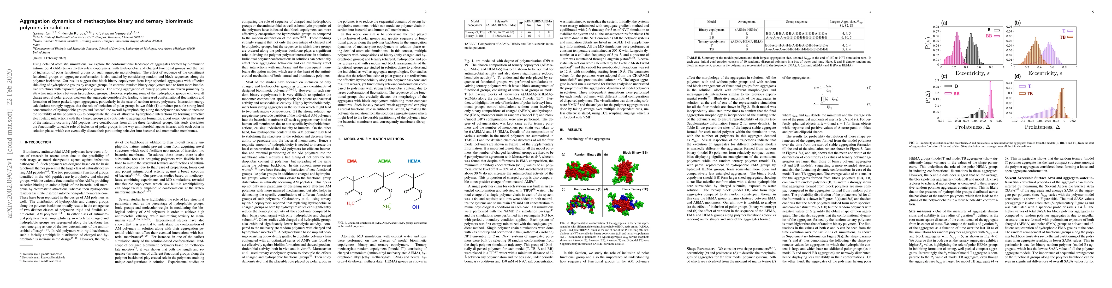 Using detailed atomistic simulations,we explore the conformational landscape of aggregates formed by biomimetic antimicrobial(AM) binary methacrylate copolymers,with hydrophobic and charged functional groups and the role of inclusion of polar functional groups on such aggregate morphologies.The effect of sequence of the constituent functional groups on aggregate conformation is also studied by considering random and block sequences along the polymer backbone.Our results suggest that block binary copolymers form large spherical aggregates with effective shielding of hydrophobic groups by charged groups.In contrast, random binary copolymers tend to form more bundle-like structures with exposed hydrophobic groups.The strong aggregation of binary polymers is driven primarily by attractive interactions between hydrophobic groups.However,replacing some of the hydrophobic groups with overall charge neutral polar groups weakens the aggregate considerably, leading to increased conformational fluctuations and formation of loose-packed,open aggregates,particularly in case of random ternary polymers.Interaction energy calculations strongly suggest that the role of inclusion of polar groups is two-fold: (1)to reduce possible strong local concentration of hydrophobic groups and smear the hydrophobicity along the polymer backbone to increase the solubility of the polymers (2)to compensate the loss of attractive hydrophobic interactions by forming attractive electrostatic interactions with charged groups and contribute to aggregation formation,albeit weak.Given that most of the naturally occurring AM peptides have contributions from all the three functional groups,this study elucidates the functionally tuneable role of inclusion of polar groups in the way AM agents interact with each other in solution phase,which can eventually dictate their partitioning behavior into bacterial and mammalian membranes.