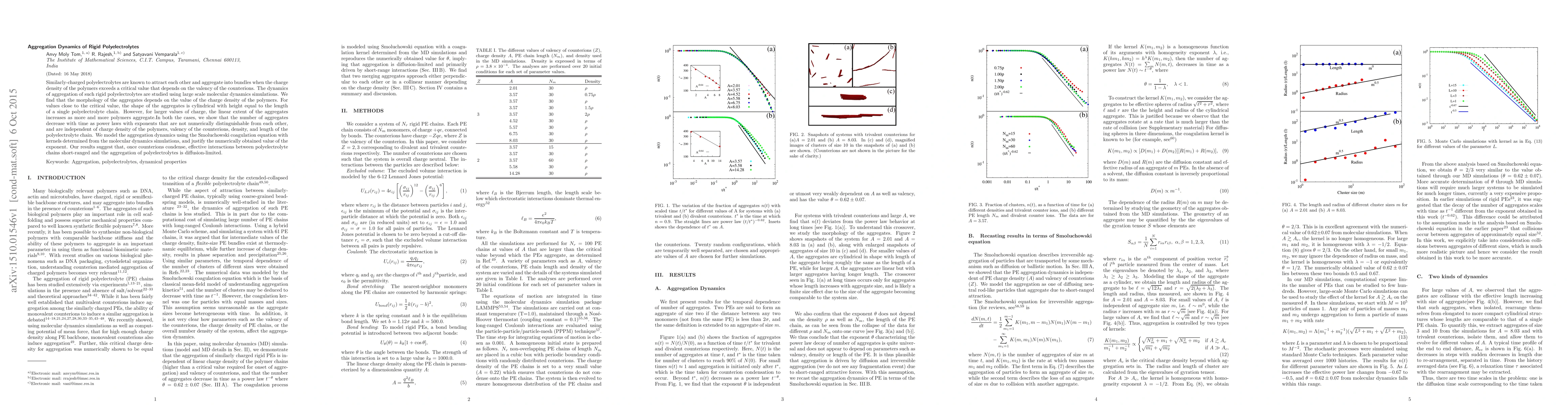 This research investigates the aggregation dynamics of rigid polyelectrolytes using molecular dynamics simulations, finding that aggregate morphology varies with charge density. The number of aggregates decreases over time following a power law, independent of polymer properties, suggesting diffusion-limited aggregation once counterions condense.