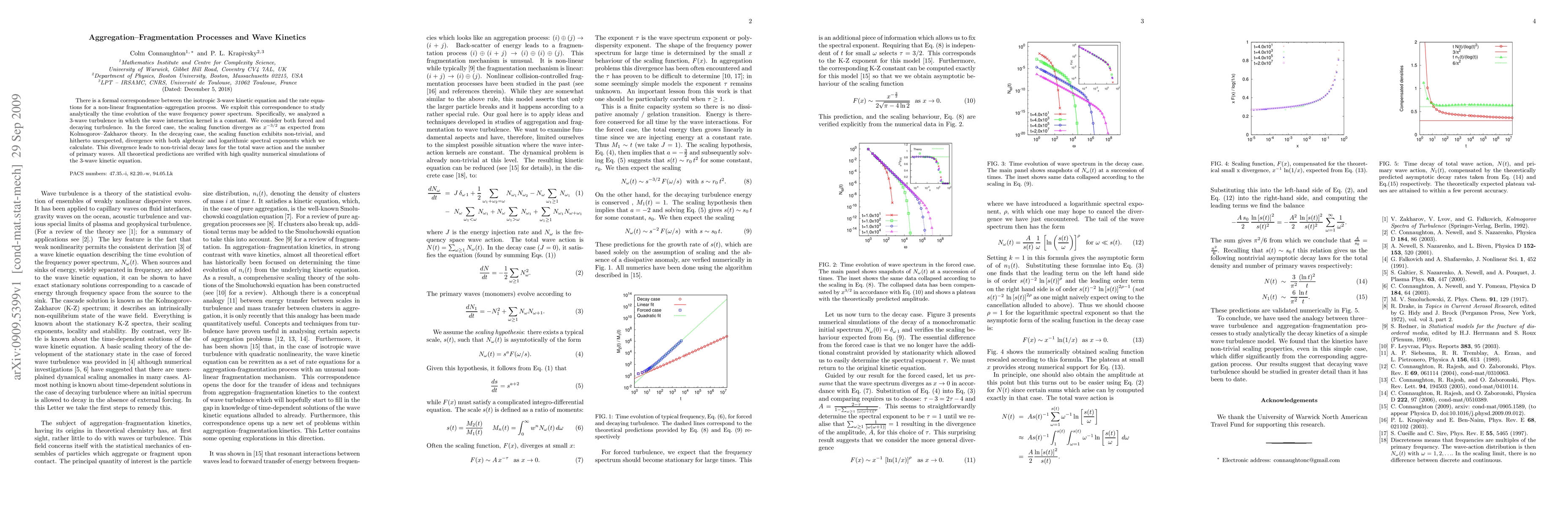 There is a formal correspondence between the isotropic 3-wave kinetic equation and the rate equations for a non-linear fragmentation--aggregation process. We exploit this correspondence to study analytically the time evolution of the wave frequency power spectrum. Specifically, we analyzed a 3-wave turbulence in which the wave interaction kernel is a constant. We consider both forced and decaying turbulence. In the forced case, the scaling function diverges as $x^{-3/2}$ as expected from Kolmogorov-Zakharov theory. In the decaying case, the scaling function exhibits non-trivial, and hitherto unexpected, divergence with both algebraic and logarithmic spectral exponents which we calculate. This divergence leads to non-trivial decay laws for the total wave action and the number of primary waves. All theoretical predictions are verified with high quality numerical simulations of the 3-wave kinetic equation.