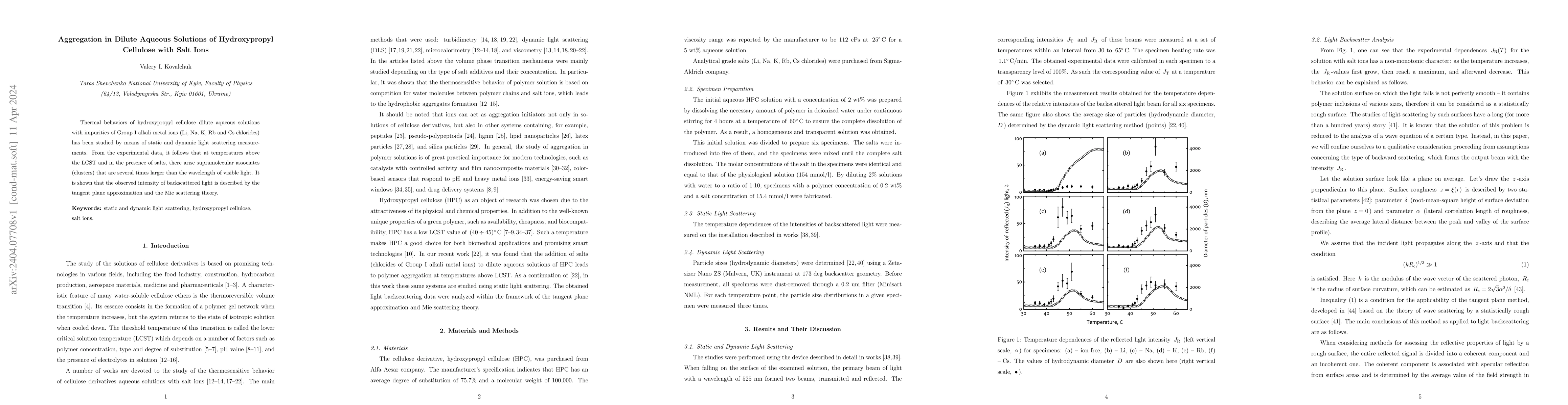 This study investigates thermal behavior in dilute aqueous solutions of hydroxypropyl cellulose with Group I alkali metal ions using light scattering. Results reveal the formation of supramolecular clusters above the LCST in the presence of salts, with scattering described by tangent plane approximation and Mie theory.