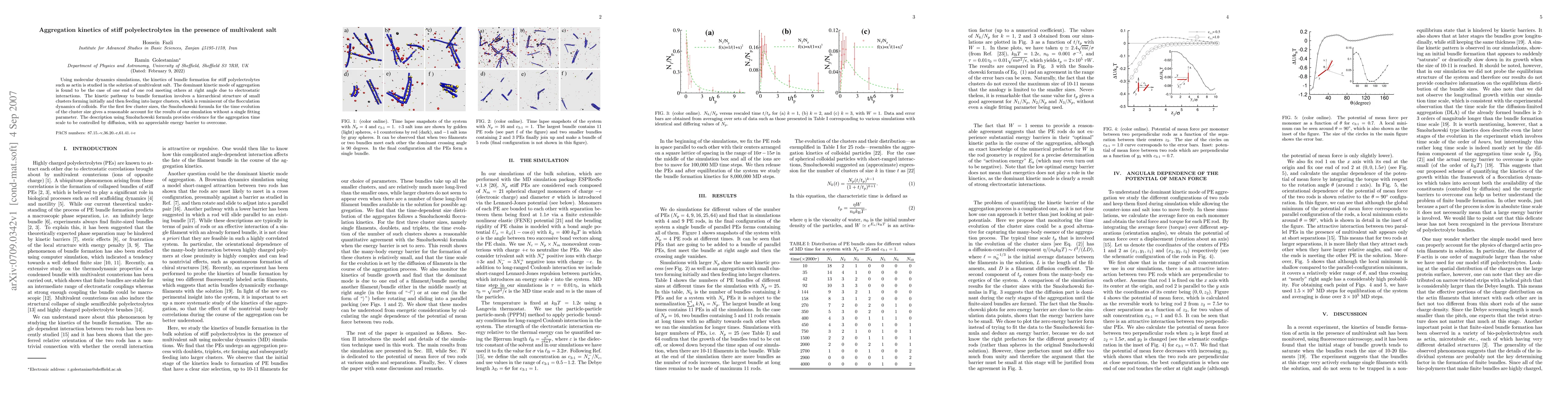 This paper uses molecular dynamics simulations to study the kinetics of stiff polyelectrolyte aggregation in multivalent salt solutions, finding that bundle formation primarily occurs through right-angle encounters due to electrostatic interactions. The aggregation process follows a hierarchical cluster formation pathway, similar to colloidal flocculation, and the Smoluchowski formula accurately describes the initial cluster size evolution without fitting parameters.