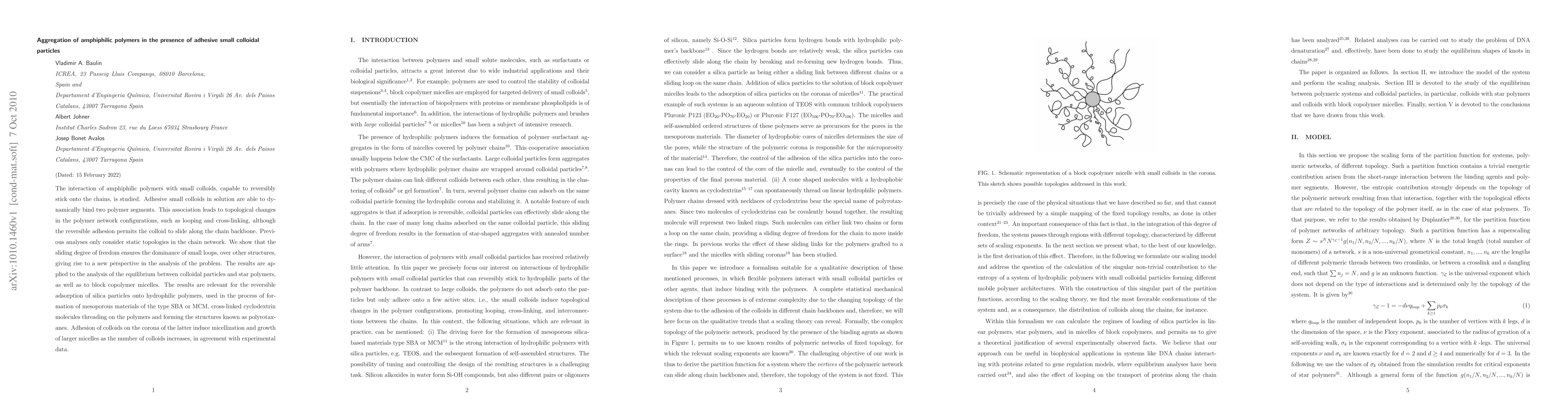 The interaction of amphiphilic polymers with small colloids, capable to reversibly stick onto the chains, is studied. Adhesive small colloids in solution are able to dynamically bind two polymer segments. This association leads to topological changes in the polymer network configurations, such as looping and cross-linking, although the reversible adhesion permits the colloid to slide along the chain backbone. Previous analyses only consider static topologies in the chain network. We show that the sliding degree of freedom ensures the dominance of small loops, over other structures, giving rise to a new perspective in the analysis of the problem. The results are applied to the analysis of the equilibrium between colloidal particles and star polymers, as well as to block copolymer micelles. The results are relevant for the reversible adsorption of silica particles onto hydrophilic polymers, used in the process of formation of mesoporous materials of the type SBA or MCM, cross-linked cyclodextrin molecules threading on the polymers and forming the structures known as polyrotaxanes. Adhesion of colloids on the corona of the latter induce micellization and growth of larger micelles as the number of colloids increases, in agreement with experimental data.