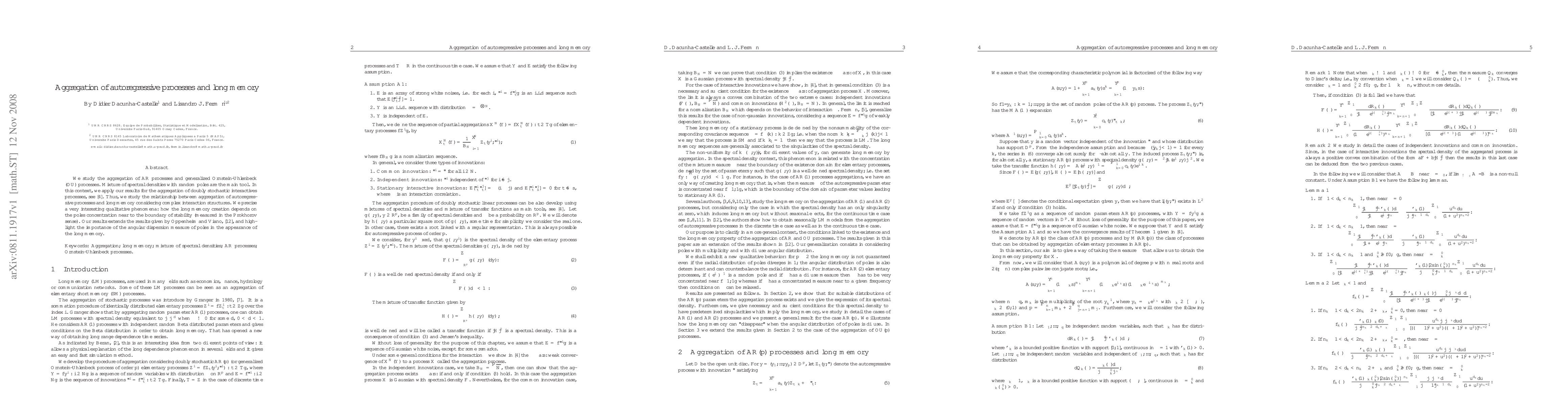 We study the aggregation of AR processes and generalized Ornstein-Uhlenbeck (OU) processes. Mixture of spectral densities with random poles are the main tool. In this context, we apply our results for the aggregation of doubly stochastic interactives processes, see Dacunha-Castelle and Fermin (2006). Thus, we study the relationship between aggregation of autoregressive processes and long memory considering complex interaction structures. We precise a very interesting qualitative phenomena: how the long memory creation depends on the poles concentration near to the boundary of stability (measured in the Prokhorov sense). Our results extends the results given by Oppenheim and Viano (2004), and highlight the importance of the angular dispersion measure of poles in the appearance of the long memory.