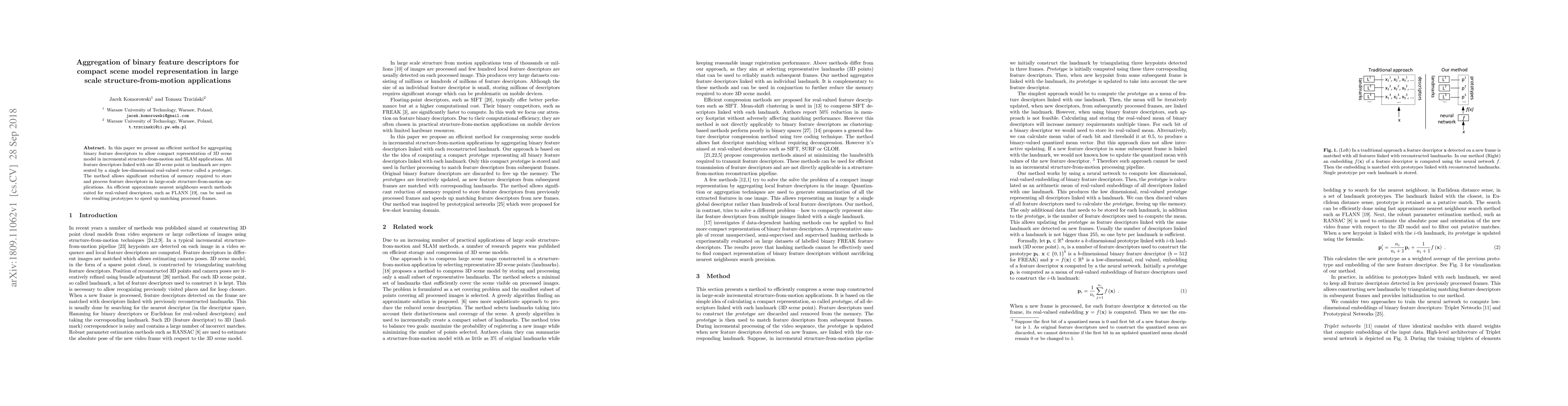 This paper proposes an efficient method to aggregate binary feature descriptors into a single low-dimensional real-valued vector, called a prototype, for compact representation of 3D scene models in large-scale structure-from-motion and SLAM applications, significantly reducing memory requirements and speeding up matching with FLANN.