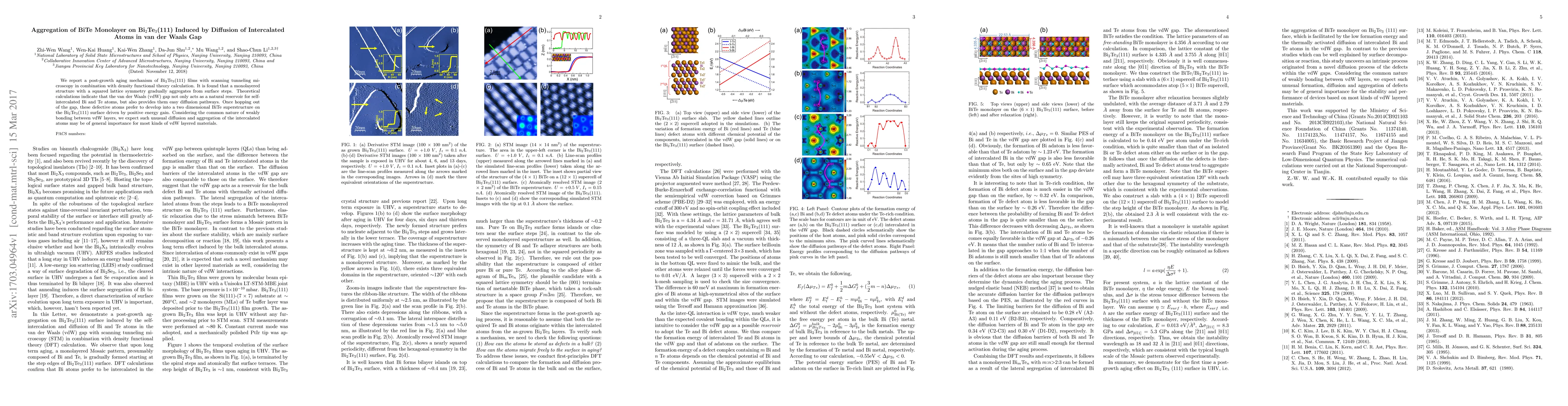 This paper investigates the post-growth aging mechanism of Bi$_2$Te$_3$(111) films, revealing that BiTe monolayers aggregate from surface steps via diffusion of intercalated Bi and Te atoms in the van der Waals gap, driven by positive energy gain. Theoretical calculations suggest this diffusion and aggregation process may be common for other van der Waals layered materials.