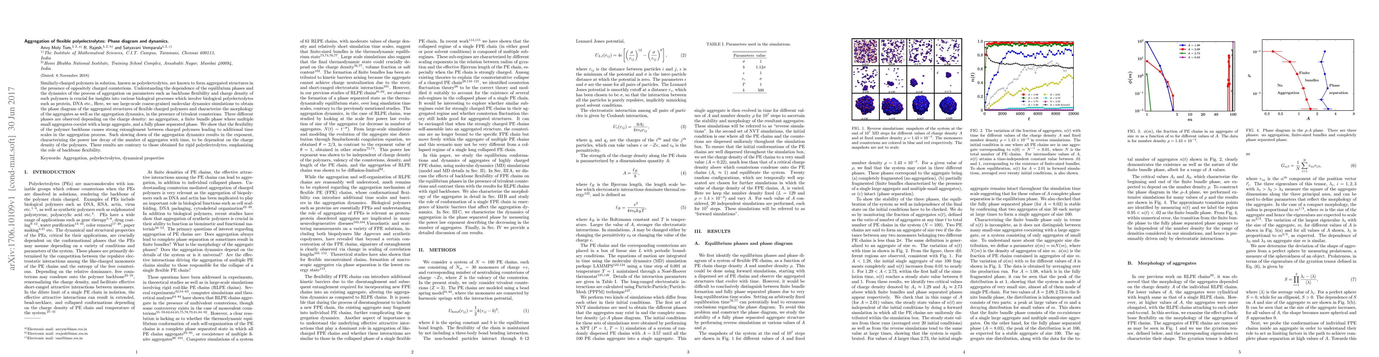 This paper investigates the aggregation of flexible polyelectrolytes using molecular dynamics simulations, revealing three distinct phases based on charge density: no aggregation, a bundle phase, and full phase separation. The polymer backbone's flexibility significantly influences aggregation dynamics, introducing additional time scales and altering the power law decay exponent, contrasting with the behavior of rigid polyelectrolytes.