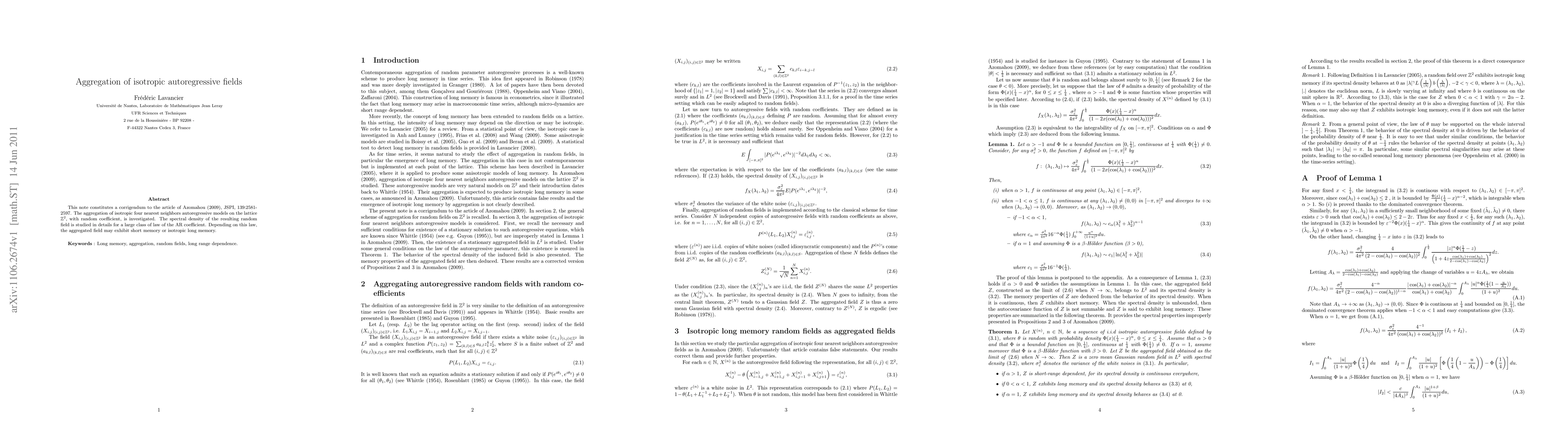 This note constitutes a corrigendum to the article of Azomahou, JSPI, 139:2581-2597. The aggregation of isotropic four nearest neighbors autoregressive models on the lattice, with random coefficient, is investigated. The spectral density of the resulting random field is studied in details for a large class of law of the AR coefficient. Depending on this law, the aggregated field may exhibit short memory or isotropic long memory.