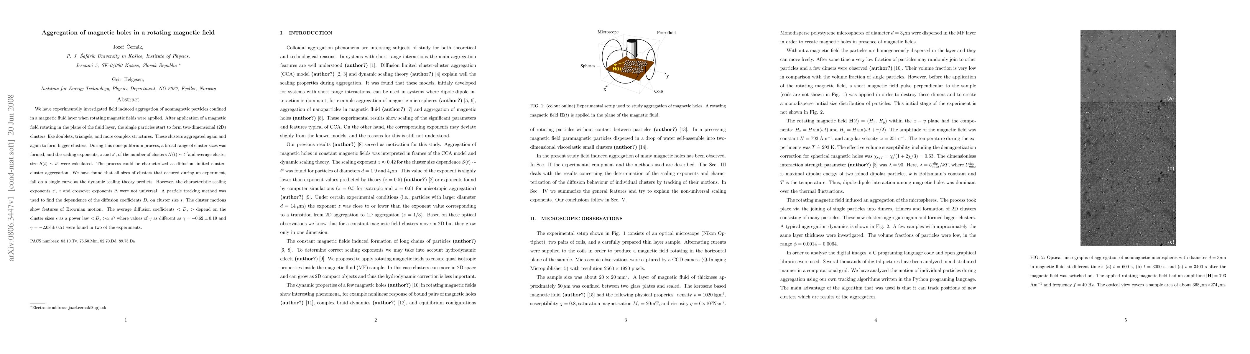 This study experimentally investigates the aggregation of nonmagnetic particles in a magnetic fluid layer under a rotating magnetic field, leading to the formation of complex 2D clusters. The process follows diffusion-limited cluster-cluster aggregation, with non-universal scaling exponents and varying diffusion coefficients for clusters, showing features of Brownian motion.