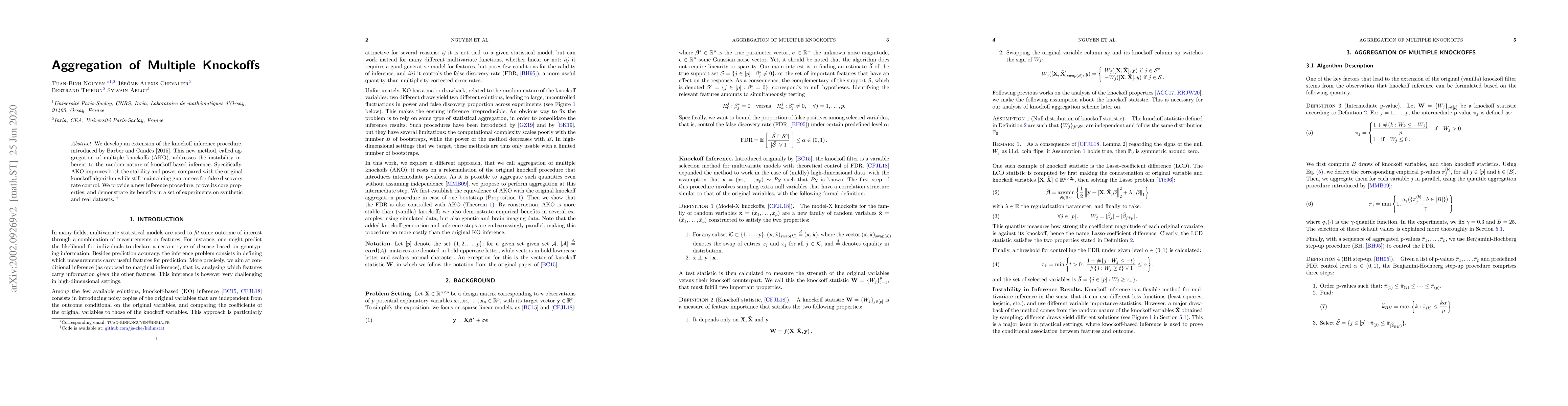 The paper introduces Aggregation of Multiple Knockoffs (AKO), an enhanced version of the Knockoff Inference procedure that improves stability and power while maintaining False Discovery Rate control, and demonstrates its effectiveness through synthetic and real-world experiments.