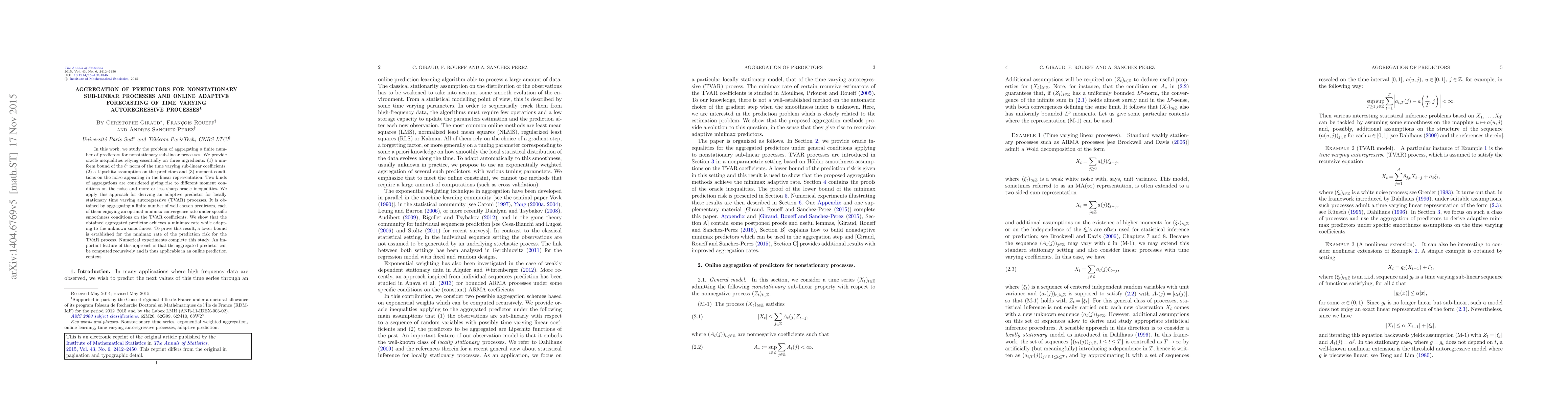 In this work, we study the problem of aggregating a finite number of predictors for nonstationary sub-linear processes. We provide oracle inequalities relying essentially on three ingredients: (1) a uniform bound of the $\ell^1$ norm of the time varying sub-linear coefficients, (2) a Lipschitz assumption on the predictors and (3) moment conditions on the noise appearing in the linear representation. Two kinds of aggregations are considered giving rise to different moment conditions on the noise and more or less sharp oracle inequalities. We apply this approach for deriving an adaptive predictor for locally stationary time varying autoregressive (TVAR) processes. It is obtained by aggregating a finite number of well chosen predictors, each of them enjoying an optimal minimax convergence rate under specific smoothness conditions on the TVAR coefficients. We show that the obtained aggregated predictor achieves a minimax rate while adapting to the unknown smoothness. To prove this result, a lower bound is established for the minimax rate of the prediction risk for the TVAR process. Numerical experiments complete this study. An important feature of this approach is that the aggregated predictor can be computed recursively and is thus applicable in an online prediction context.