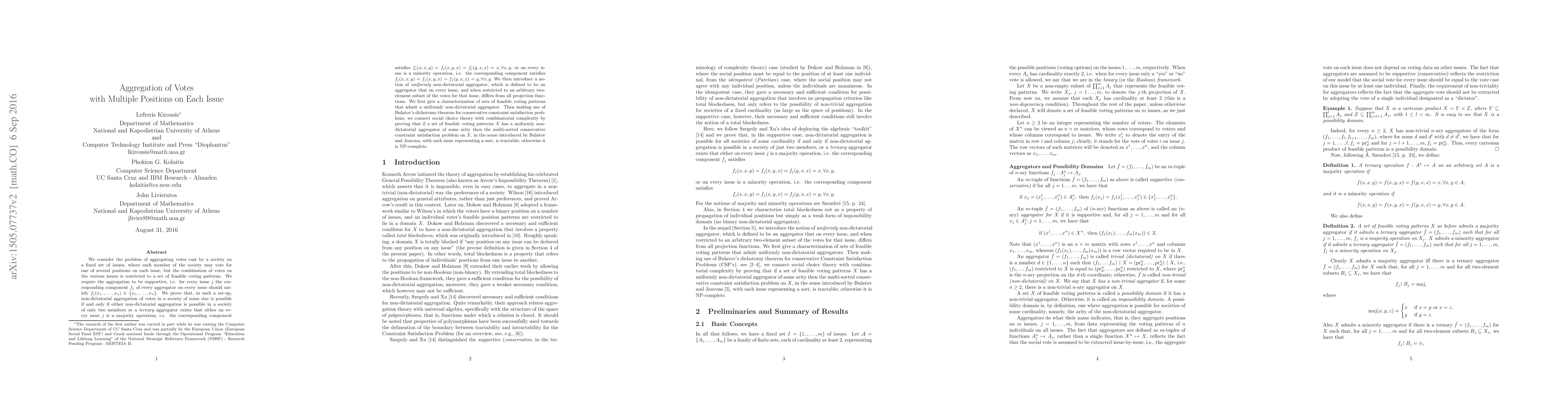 This paper explores vote aggregation in a society with multiple issue positions per member, ensuring supportiveness. It proves that non-dictatorial aggregation is possible if a ternary aggregator is either a majority or minority operation, or if a two-member society allows non-dictatorial aggregation. The paper also introduces a uniformly non-dictatorial aggregator, characterizing feasible voting patterns that admit such aggregation. It connects social choice theory with combinatorial complexity, showing tractability of certain conservative constraint satisfaction problems under these conditions, otherwise NP-complete.