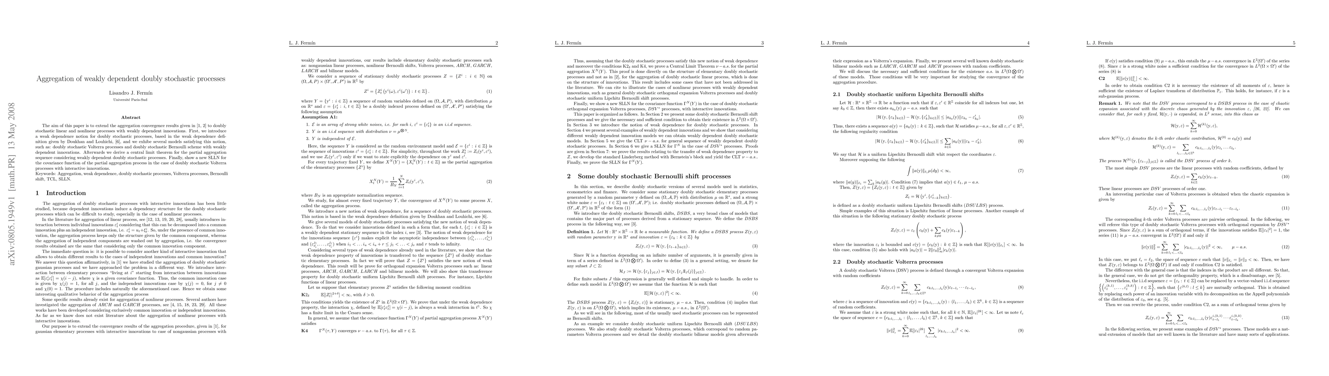 The aim of this paper is to extend the aggregation convergence results given in (Dacunha-Castelle and Fermin 2005, Dacunha-Castelle and Fermin 2008) to doubly stochastic linear and nonlinear processes with weakly dependent innovations. First, we introduce a weak dependence notion for doubly stochastic processes, based in the weak dependence definition given in (Doukhan and Louhichi 1999), and we exhibe several models satisfying this notion, such as: doubly stochastic Volterra processes and doubly stochastic Bernoulli scheme with weakly dependent innovations. Afterwards we derive a central limit theorem for the partial aggregation sequence considering weakly dependent doubly stochastic processes. Finally, show a new SLLN for the covariance function of the partial aggregation process in the case of doubly stochastic Volterra processes with interactive innovations. Keywords: Aggregation, weak dependence, doubly stochastic processes, Volterra processes, Bernoulli shift, TCL, SLLN.