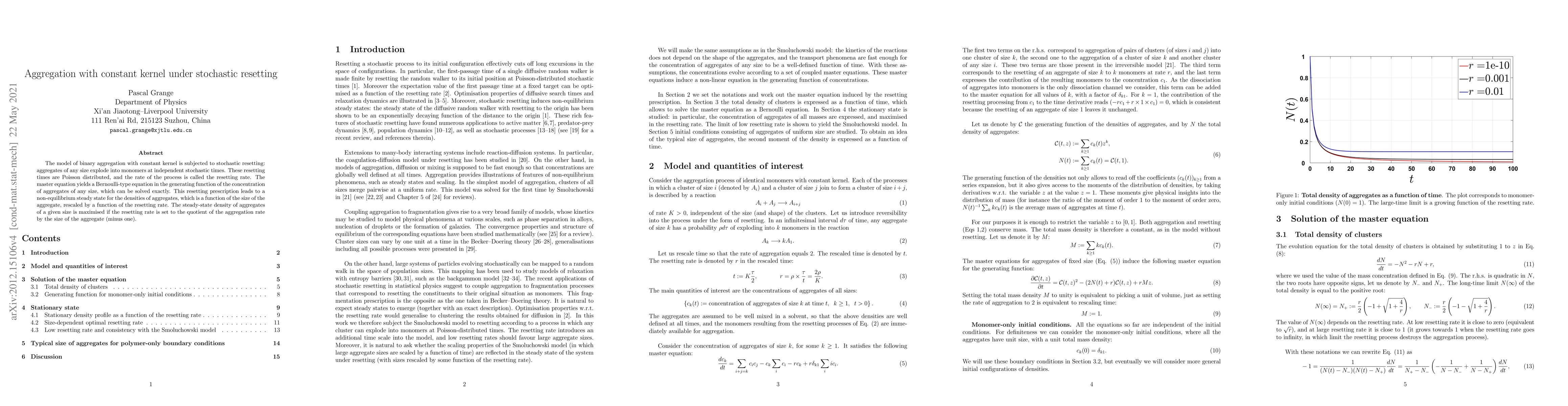 This paper investigates binary aggregation with constant kernel under stochastic resetting, where aggregates reset to monomers at Poisson-distributed times. The exact solution of the master equation reveals a non-equilibrium steady state dependent on aggregate size and resetting rate, with maximum steady-state density achieved when the resetting rate equals the ratio of the aggregation rate to the aggregate size minus one.