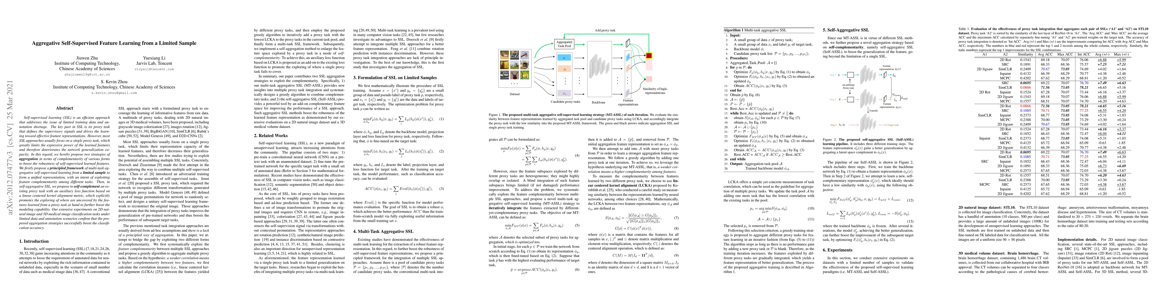 Self-supervised learning (SSL) is an efficient approach that addresses the issue of limited training data and annotation shortage. The key part in SSL is its proxy task that defines the supervisory signals and drives the learning toward effective feature representations. However, most SSL approaches usually focus on a single proxy task, which greatly limits the expressive power of the learned features and therefore deteriorates the network generalization capacity. In this regard, we hereby propose two strategies of aggregation in terms of complementarity of various forms to boost the robustness of self-supervised learned features. We firstly propose a principled framework of multi-task aggregative self-supervised learning from a limited sample to form a unified representation, with an intent of exploiting feature complementarity among different tasks. Then, in self-aggregative SSL, we propose to self-complement an existing proxy task with an auxiliary loss function based on a linear centered kernel alignment metric, which explicitly promotes the exploring of where are uncovered by the features learned from a proxy task at hand to further boost the modeling capability. Our extensive experiments on 2D natural image and 3D medical image classification tasks under limited data and annotation scenarios confirm that the proposed aggregation strategies successfully boost the classification accuracy.