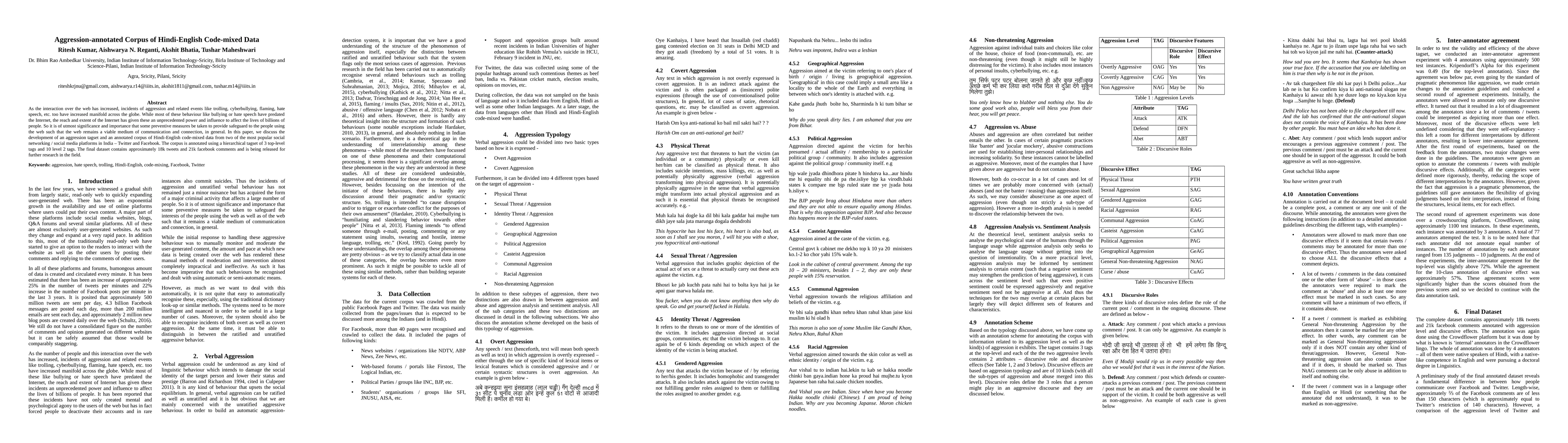 The paper describes the development of an aggression-annotated corpus of Hindi-English code-mixed data from Twitter and Facebook, using a hierarchical tagset with 3 top-level tags and 10 level 2 tags.