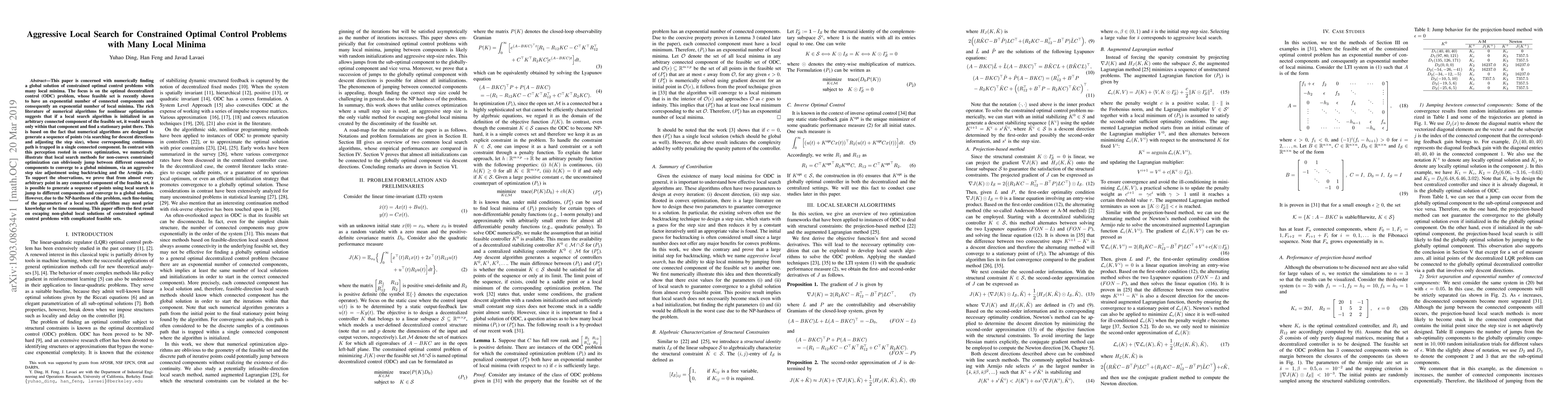 This paper is concerned with numerically finding a global solution of constrained optimal control problems with many local minima. The focus is on the optimal decentralized control (ODC) problem, whose feasible set is recently shown to have an exponential number of connected components and consequently an exponential number of local minima. The rich literature of numerical algorithms for nonlinear optimization suggests that if a local search algorithm is initialized in an arbitrary connected component of the feasible set, it would search only within that component and find a stationary point there. This is based on the fact that numerical algorithms are designed to generate a sequence of points (via searching for descent directions and adjusting the step size), whose corresponding continuous path is trapped in a single connected component. In contrast with this perception rooted in convex optimization, we numerically illustrate that local search methods for non-convex constrained optimization can obliviously jump between different connected components to converge to a global minimum, via an aggressive step size adjustment using backtracking and the Armijio rule. To support the observations, we prove that from almost every arbitrary point in any connected component of the feasible set, it is possible to generate a sequence of points using local search to jump to different components and converge to a global solution. However, due to the NP-hardness of the problem, such fine-tuning of the parameters of a local search algorithm may need prior knowledge or be time consuming. This paper offers the first result on escaping non-global local solutions of constrained optimal control problems with complicated feasible sets.