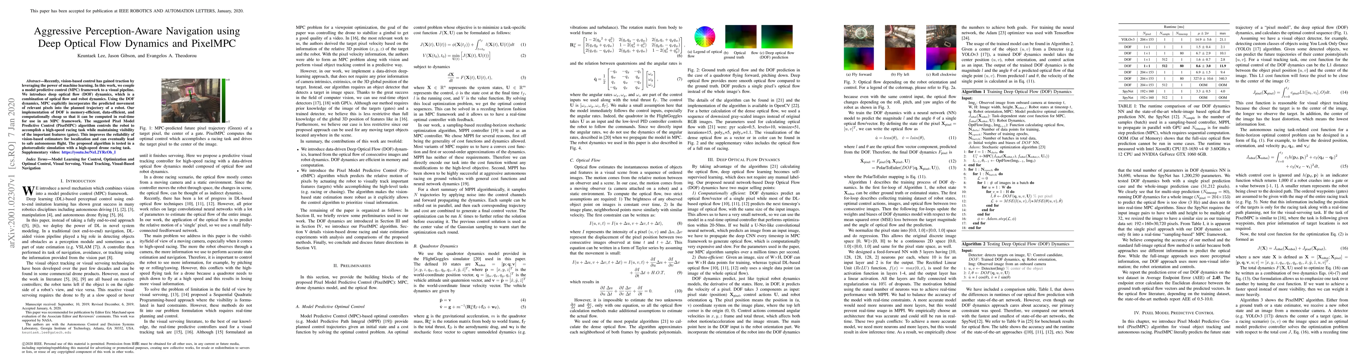 Recently, vision-based control has gained traction by leveraging the power of machine learning. In this work, we couple a model predictive control (MPC) framework to a visual pipeline. We introduce deep optical flow (DOF) dynamics, which is a combination of optical flow and robot dynamics. Using the DOF dynamics, MPC explicitly incorporates the predicted movement of relevant pixels into the planned trajectory of a robot. Our implementation of DOF is memory-efficient, data-efficient, and computationally cheap so that it can be computed in real-time for use in an MPC framework. The suggested Pixel Model Predictive Control (PixelMPC) algorithm controls the robot to accomplish a high-speed racing task while maintaining visibility of the important features (gates). This improves the reliability of vision-based estimators for localization and can eventually lead to safe autonomous flight. The proposed algorithm is tested in a photorealistic simulation with a high-speed drone racing task.