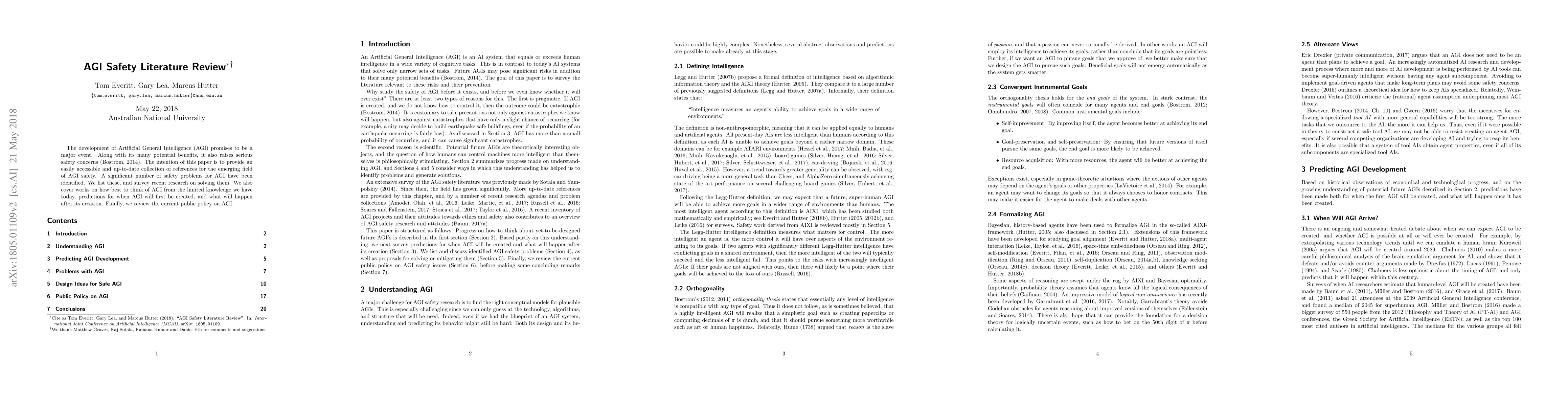 This paper offers a comprehensive review of the AGI safety literature, highlighting identified safety issues and recent research aimed at addressing them. It also explores conceptual frameworks for understanding AGI and discusses the timeline and consequences of AGI creation, along with current public policy considerations.