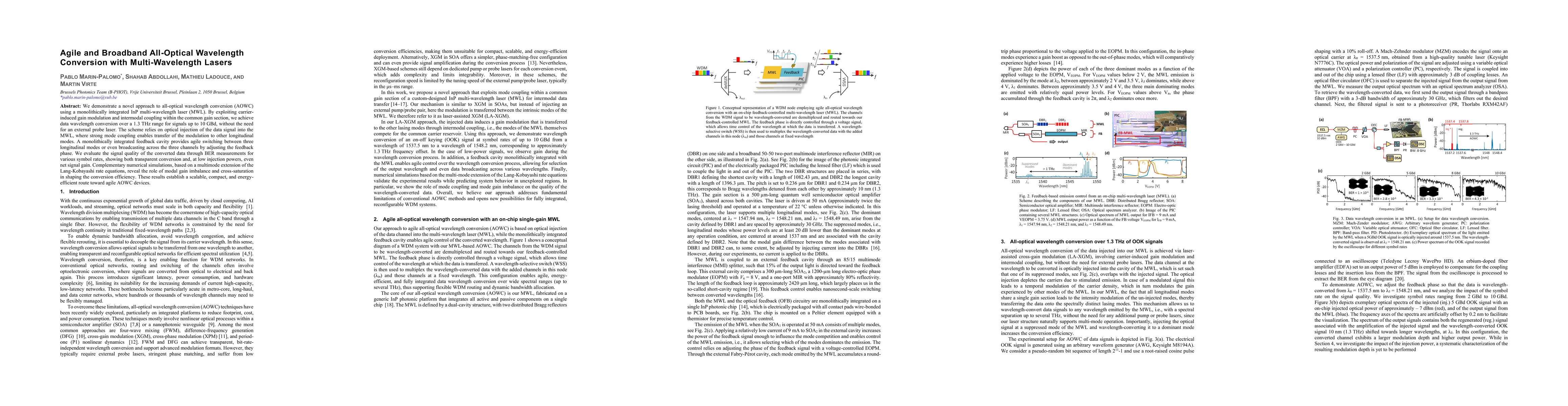 We demonstrate a novel approach to all-optical wavelength conversion (AOWC) using a monolithically integrated InP multi-wavelength laser (MWL). By exploiting carrier-induced gain modulation and intermodal coupling within the common gain section, we achieve data wavelength conversion over a 1.3 THz range for signals up to 10 GBd, without the need for an external probe laser. The scheme relies on optical injection of the data signal into the MWL, where strong mode coupling enables transfer of the modulation to other longitudinal modes. A monolithically integrated feedback cavity provides agile switching between three longitudinal modes or even broadcasting across the three channels by adjusting the feedback phase. We evaluate the signal quality of the converted data through BER measurements for various symbol rates, showing both transparent conversion and, at low injection powers, even net signal gain. Complementary numerical simulations, based on a multimode extension of the Lang-Kobayashi rate equations, reveal the role of modal gain imbalance and cross-saturation in shaping the conversion efficiency. These results establish a scalable, compact, and energy-efficient route toward agile AOWC devices.