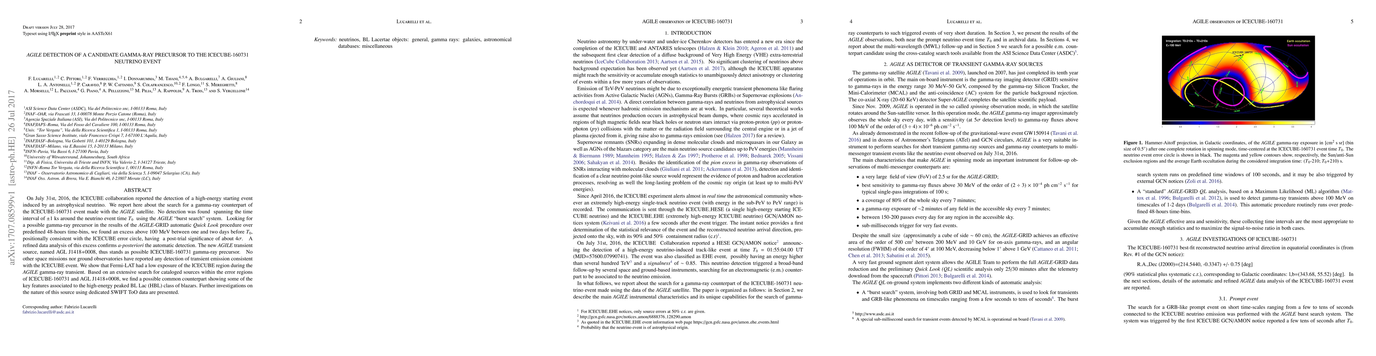 The AGILE satellite did not detect a gamma-ray precursor within 1 ks of the ICECUBE-160731 neutrino event, but found a 4 sigma gamma-ray excess from AGL J1418+0008, a possible precursor, 1-2 days prior. No other missions detected a precursor, yet Fermi-LAT had low exposure. A potential BL Lac counterpart was identified, warranting further Swift ToO investigations.