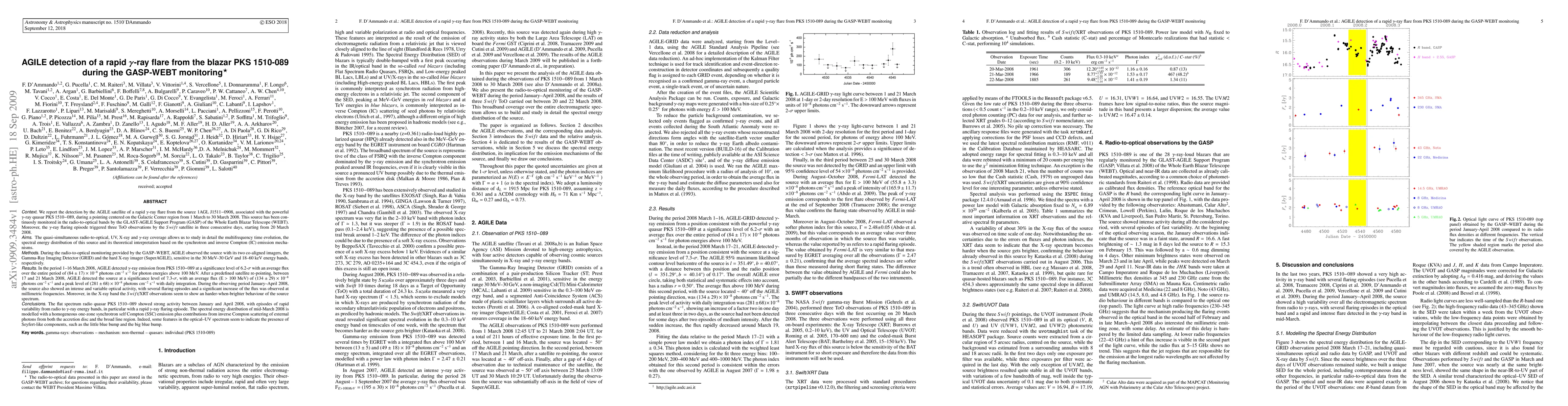 The AGILE satellite detected a rapid gamma-ray flare from the blazar PKS 1510-089 during the GASP-WEBT monitoring in March 2008, triggering Swift satellite observations. The flare showed significant variability and a harder-when-brighter X-ray spectrum, with the spectral energy distribution modeled by synchrotron self Compton emission and inverse Compton scattering.
