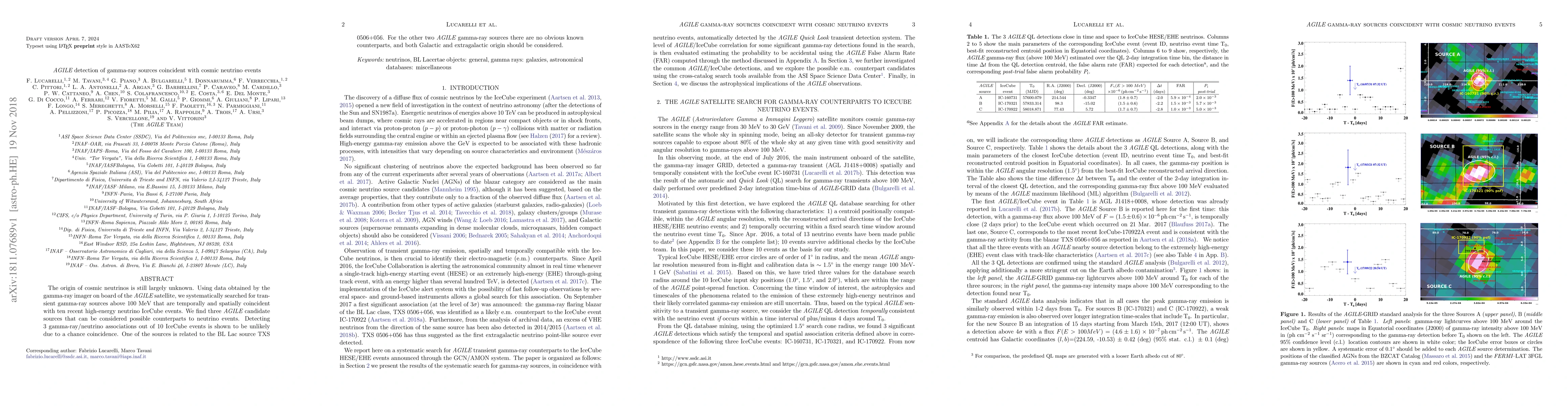 The origin of cosmic neutrinos is still largely unknown. Using data obtained by the gamma-ray imager on board of the AGILE satellite, we systematically searched for transient gamma-ray sources above 100 MeV that are temporally and spatially coincident with ten recent high-energy neutrino IceCube events. We find three AGILE candidate sources that can be considered possible counterparts to neutrino events. Detecting 3 gamma-ray/neutrino associations out of 10 IceCube events is shown to be unlikely due to a chance coincidence. One of the sources is related to the BL Lac source TXS 0506+056. For the other two AGILE gamma-ray sources there are no obvious known counterparts, and both Galactic and extragalactic origin should be considered.