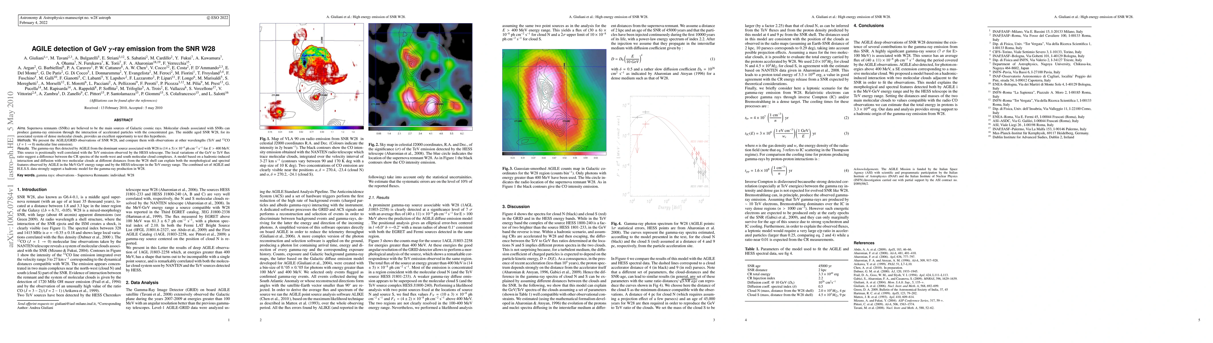 This paper reports AGILE/GRID observations of the supernova remnant W28, detecting GeV gamma-ray emission correlated with TeV emissions, suggesting a hadronic origin. The study supports a model of cosmic ray interactions with molecular clouds, revealing differences in cosmic ray spectra between cloud complexes.