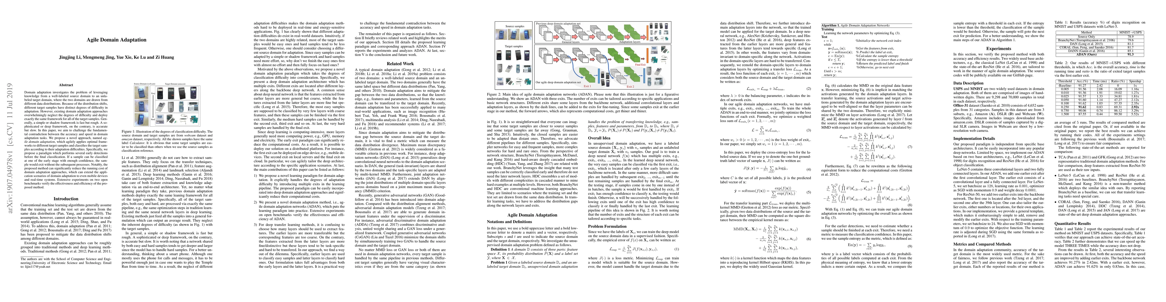 This paper proposes an "agile domain adaptation" approach that dynamically selects optimal frameworks for different target samples based on their adaptation difficulties, thereby balancing accuracy and speed. The method employs early detections to classify samples with sufficient confidence early on, reducing computational costs and extending domain adaptation's applicability to mobile and real-time systems.