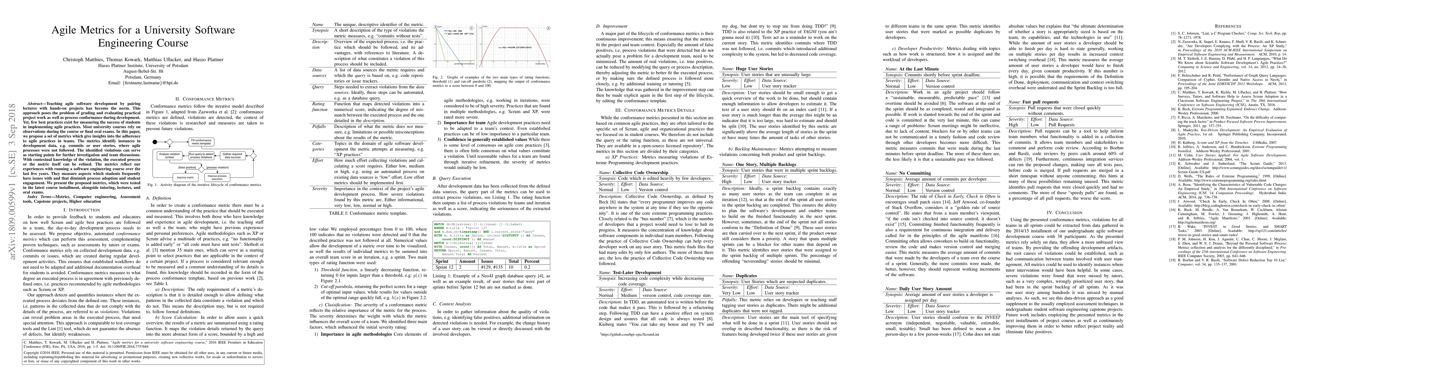 Teaching agile software development by pairing lectures with hands-on projects has become the norm. This approach poses the problem of grading and evaluating practical project work as well as process conformance during development. Yet, few best practices exist for measuring the success of students in implementing agile practices. Most university courses rely on observations during the course or final oral exams. In this paper, we propose a set of metrics which give insights into the adherence to agile practices in teams. The metrics identify instances in development data, e.g. commits or user stories, where agile processes were not followed. The identified violations can serve as starting points for further investigation and team discussions. With contextual knowledge of the violation, the executed process or the metric itself can be refined. The metrics reflect our experiences with running a software engineering course over the last five years. They measure aspects which students frequently have issues with and that diminish process adoption and student engagement. We present the proposed metrics, which were tested in the latest course installment, alongside tutoring, lectures, and oral exams.