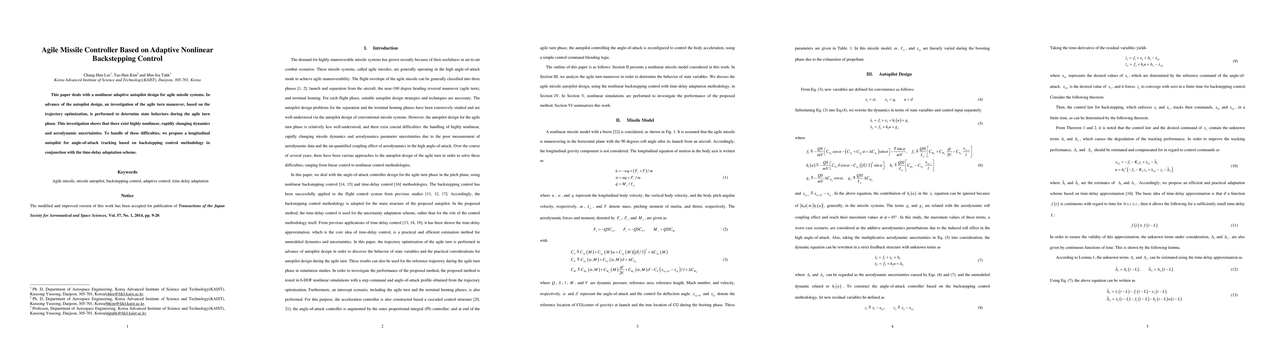 This paper presents an adaptive nonlinear backstepping control design for agile missile autopilots, addressing highly nonlinear and rapidly changing dynamics through a time-delay adaptation scheme for angle-of-attack tracking during agile turn maneuvers.