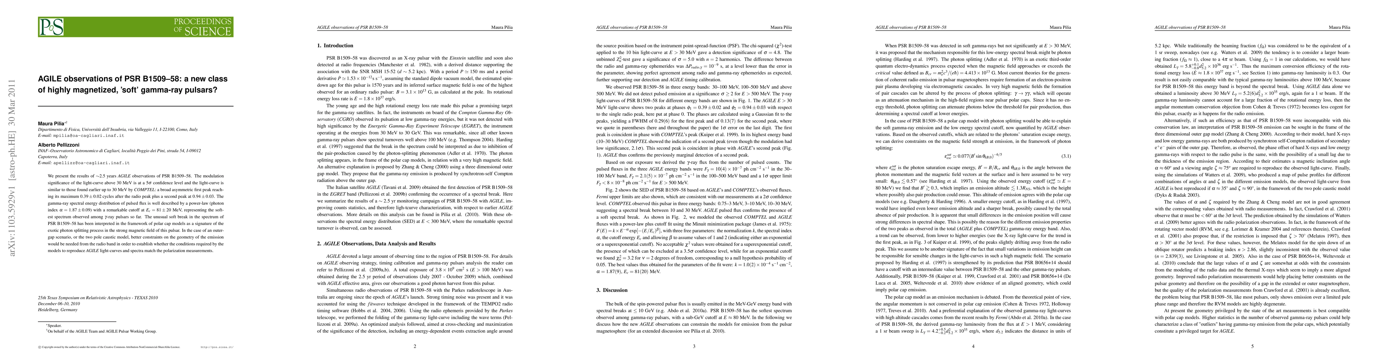 We present the results of 2.5 years AGILE observations of PSR B1509-58. The modulation significance of the light-curve above 30 MeV is at a sigma confidence level and the light-curve is similar to those found earlier up to 30 MeV by \comp: a broad asymmetric first peak reaching its maximum 0.39 +/- 0.02 cycles after the radio peak plus a second peak at 0.94 +/- 0.03. The gamma-ray spectral energy distribution of pulsed flux is well described by a power-law (photon index alpha=1.87 +/-0.09) with a remarkable cutoff at E_c=81+/- 20 MeV, representing the softest spectrum observed among gamma-ray pulsars so far. The unusual soft break in the spectrum of PSR B1509-58 has been interpreted in the framework of polar cap models as a signature of the exotic photon splitting process in the strong magnetic field of this pulsar. In the case of an outer-gap scenario, or the two pole caustic model, better constraints on the geometry of the emission would be needed from the radio band in order to establish whether the conditions required by the models to reproduce AGILE light-curves and spectra match the polarization measurements.