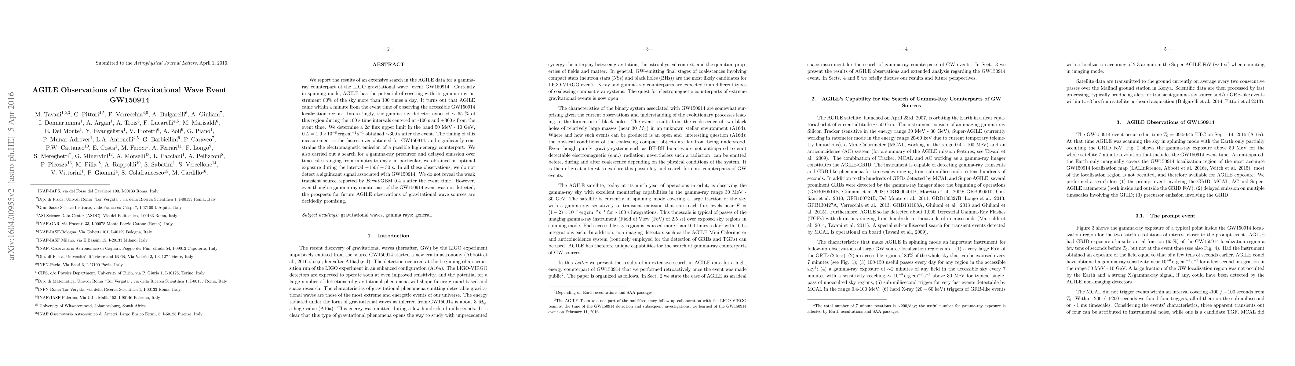 The AGILE satellite did not detect a gamma-ray counterpart to the LIGO event GW150914, setting a 2-sigma flux upper limit of $1.9 \times 10^{-8} \rm \, erg \, cm^{-2} \, s^{-1}$ 300 seconds post-event, but the timing of this measurement is the fastest ever obtained.