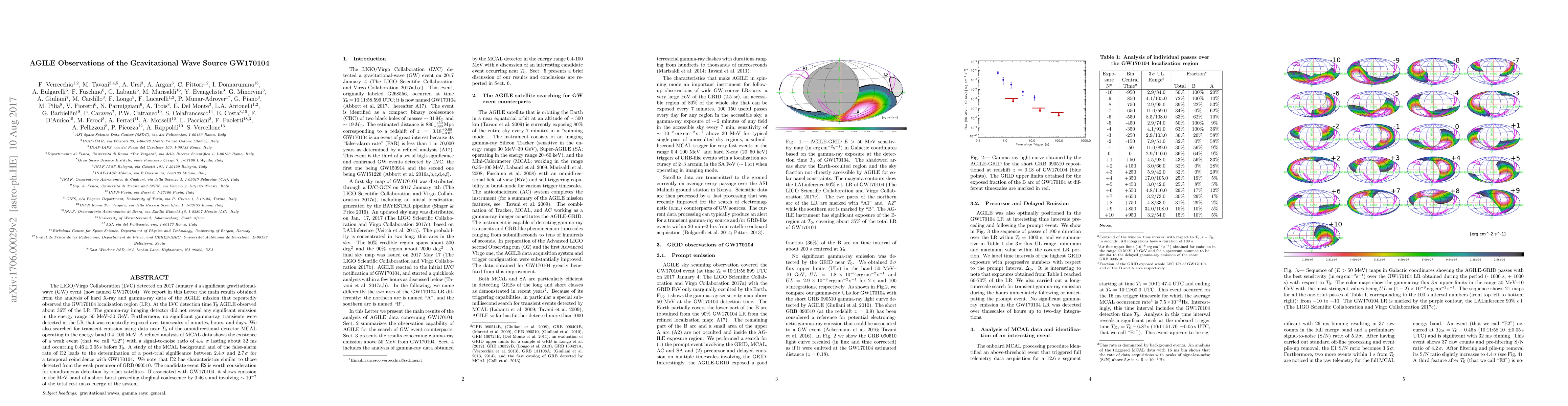 The LIGO/Virgo Collaboration (LVC) detected on 2017 January 4, a significant gravitational-wave (GW) event (now named GW170104). We report in this Letter the main results obtained from the analysis of hard X-ray and gamma-ray data of the AGILE mission that repeatedly observed the GW170104 localization region (LR). At the LVC detection time $T_0$ AGILE observed about 36% of the LR. The gamma-ray imaging detector did not reveal any significant emission in the energy range 50 MeV--30 GeV. Furthermore, no significant gamma-ray transients were detected in the LR that was repeatedly exposed over timescales of minutes, hours, and days. We also searched for transient emission using data near $T_0$ of the omnidirectional detector MCAL operating in the energy band 0.4--100 MeV. A refined analysis of MCAL data shows the existence of a weak event (that we call "E2") with a signal-to-noise ratio of $4.4\,\sigma$ lasting about 32 ms and occurring $0.46\,\pm\,0.05 \,\rm s$ before $T_0$. A study of the MCAL background and of the false-alarm rate of E2 leads to the determinination of a post-trial significance between $2.4\,\sigma$ and $2.7\,\sigma$ for a temporal coincidence with GW170104. We note that E2 has characteristics similar to those detected from the weak precursor of the short GRB 090510. The candidate event E2 is worth consideration for simultaneous detection by other satellites. If associated with GW170104, it shows emission in the MeV band of a short burst preceding the final coalescence by 0.46 sec and involving $\sim 10^{-7}$ of the total rest mass energy of the system.