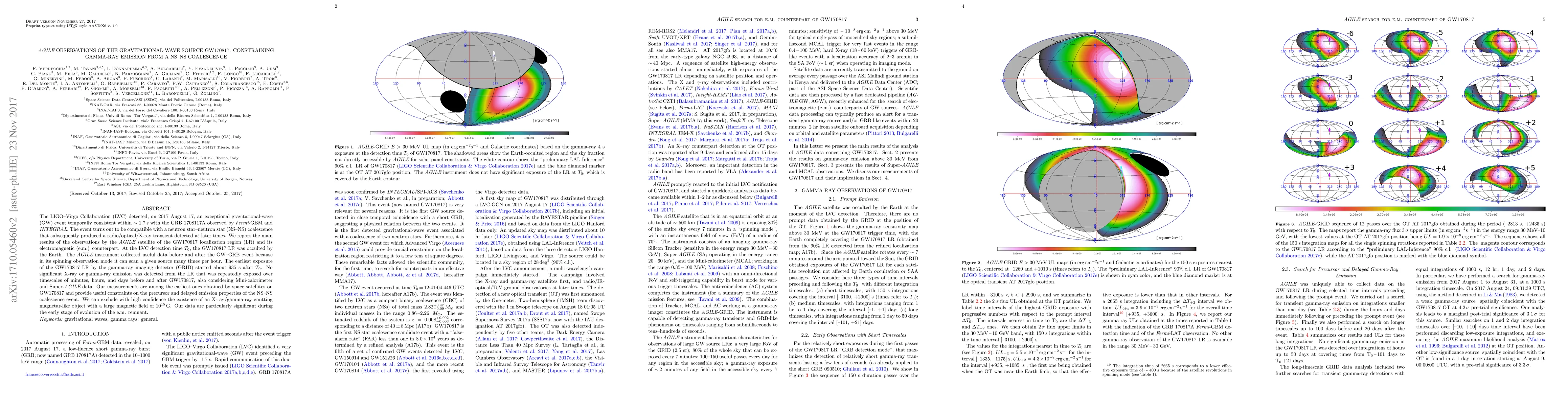 The LIGO-Virgo Collaboration (LVC) detected, on 2017 August 17, an exceptional gravitational-wave (GW) event temporally consistent within $\sim\,1.7 \, \rm s$ with the GRB 1708117A observed by Fermi-GBM and INTEGRAL. The event turns out to be compatible with a neutron star-neutron star (NS-NS) coalescence that subsequently produced a radio/optical/X-ray transient detected at later times. We report the main results of the observations by the AGILE satellite of the GW170817 localization region (LR) and its electromagnetic (e.m.) counterpart. At the LVC detection time $T_0$, the GW170817 LR was occulted by the Earth. The AGILE instrument collected useful data before and after the GW-GRB event because in its spinning observation mode it can scan a given source many times per hour. The earliest exposure of the GW170817 LR by the gamma-ray imaging detector (GRID) started about 935 s after $T_0$. No significant X-ray or gamma-ray emission was detected from the LR that was repeatedly exposed over timescales of minutes, hours, and days before and after GW170817, also considering Mini-calorimeter and Super-AGILE data. Our measurements are among the earliest ones obtained by space satellites on GW170817 and provide useful constraints on the precursor and delayed emission properties of the NS-NS coalescence event. We can exclude with high confidence the existence of an X-ray/gamma-ray emitting magnetar-like object with a large magnetic field of $10^{15} \, \rm G$. Our data are particularly significant during the early stage of evolution of the e.m. remnant.