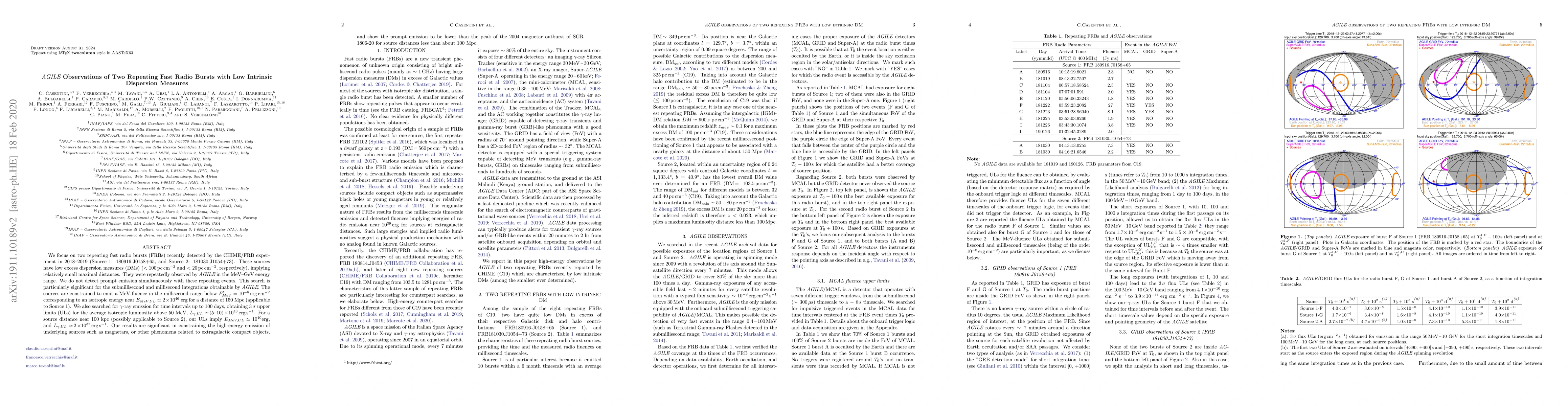 We focus on two repeating fast radio bursts (FRBs) recently detected by the CHIME/FRB experiment in 2018--2019 (Source 1: 180916.J0158+65, and Source 2: 181030.J1054+73). These sources have low excess dispersion measures (DMs) ($ < 100 \rm \, pc \, cm^{-3}$ and $ < 20 \rm \, pc \, cm^{-3}$, respectively), implying relatively small maximal distances. They were repeatedly observed by AGILE in the MeV--GeV energy range. We do not detect prompt emission simultaneously with these repeating events. This search is particularly significant for the submillisecond and millisecond integrations obtainable by AGILE. The sources are constrained to emit a MeV-fluence in the millisecond range below $F'_{MeV} = 10^{-8} \, \rm erg \, cm^{-2}$ corresponding to an isotropic energy near $E_{MeV,UL} \simeq 2 \times 10^{46}\,$erg for a distance of 150 Mpc (applicable to Source 1). We also searched for $\gamma$-ray emission for time intervals up to 100 days, obtaining 3$\,\sigma$ upper limits (ULs) for the average isotropic luminosity above 50 MeV, $L_{\gamma,UL} \simeq \,$(5-10)$\,\times 10^{43} \rm \, erg \, s^{-1}$. For a source distance near 100 kpc (possibly applicable to Source 2), our ULs imply $E_{MeV,UL}\simeq10^{40} \rm erg$, and $L_{\gamma,UL} \simeq \,$2$\,\times 10^{37} \rm \, erg \, s^{-1}$. Our results are significant in constraining the high-energy emission of underlying sources such as magnetars, or other phenomena related to extragalactic compact objects, and show the prompt emission to be lower than the peak of the 2004 magnetar outburst of SGR 1806-20 for source distances less than about 100 Mpc.