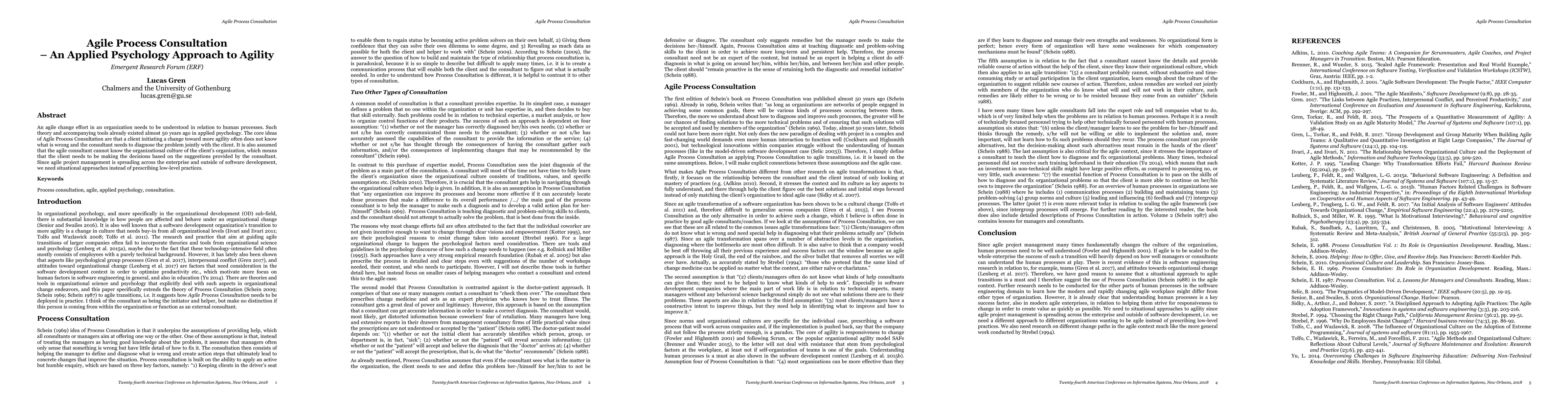 This paper proposes Agile Process Consultation, an approach that applies principles from applied psychology to diagnose and facilitate agile change in organizations. It emphasizes the necessity for consultants to work collaboratively with clients to understand and adapt to the unique organizational culture, rather than imposing predefined agile practices.