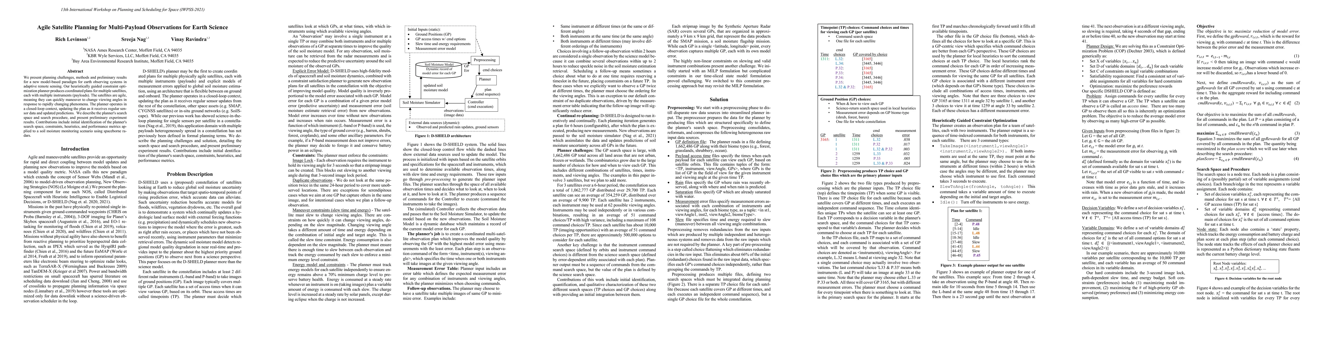 We present planning challenges, methods and preliminary results for a new model-based paradigm for earth observing systems in adaptive remote sensing. Our heuristically guided constraint optimization planner produces coordinated plans for multiple satellites, each with multiple instruments (payloads). The satellites are agile, meaning they can quickly maneuver to change viewing angles in response to rapidly changing phenomena. The planner operates in a closed-loop context, updating the plan as it receives regular sensor data and updated predictions. We describe the planner's search space and search procedure, and present preliminary experiment results. Contributions include initial identification of the planner's search space, constraints, heuristics, and performance metrics applied to a soil moisture monitoring scenario using spaceborne radars.