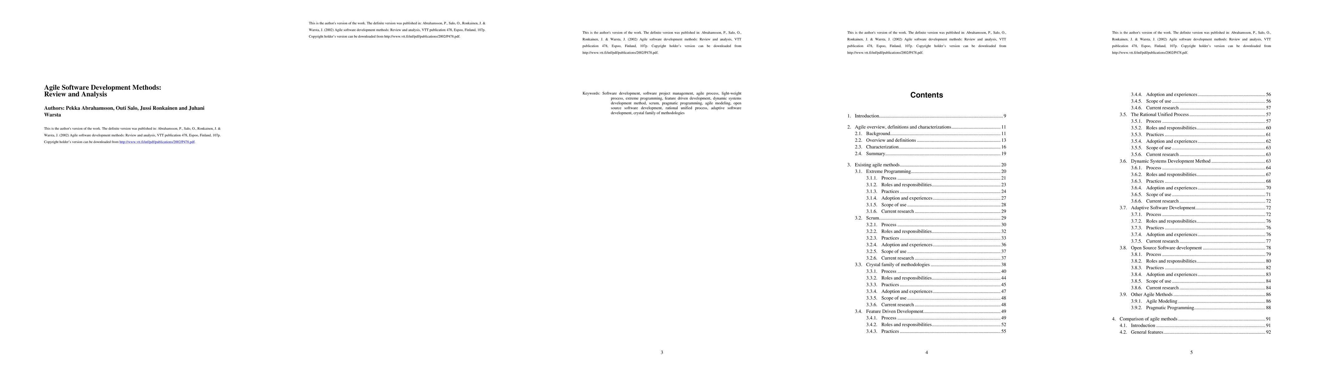 Agile - denoting "the quality of being agile, readiness for motion, nimbleness, activity, dexterity in motion" - software development methods are attempting to offer an answer to the eager business community asking for lighter weight along with faster and nimbler software development processes. This is especially the case with the rapidly growing and volatile Internet software industry as well as for the emerging mobile application environment. The new agile methods have evoked substantial amount of literature and debates. However, academic research on the subject is still scarce, as most of existing publications are written by practitioners or consultants. The aim of this publication is to begin filling this gap by systematically reviewing the existing literature on agile software development methodologies. This publication has three purposes. First, it proposes a definition and a classification of agile software development approaches. Second, it analyses ten software development methods that can be characterized as being "agile" against the defined criterion. Third, it compares these methods and highlights their similarities and differences. Based on this analysis, future research needs are identified and discussed.