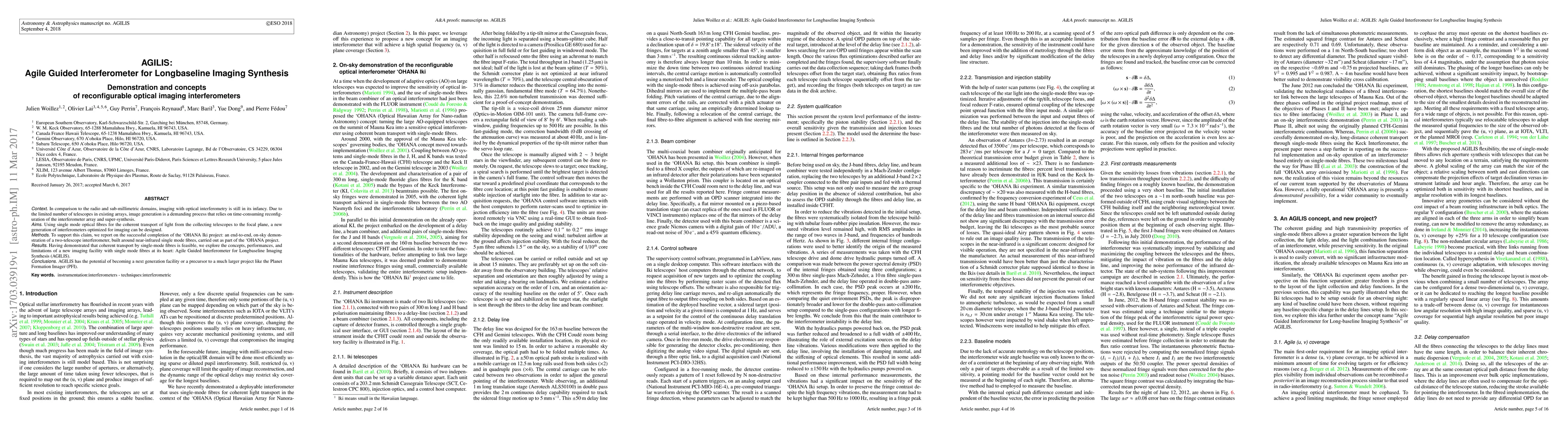 The AGILIS project demonstrates a reconfigurable optical interferometer using near-infrared single mode fibres for coherent light transport, showcasing its potential for next-generation imaging facilities and as a precursor to larger projects like the Planet Formation Imager (PFI). The OHANA Iki project successfully validated the feasibility of this technology through an on-sky two-telescope interferometer demonstration.