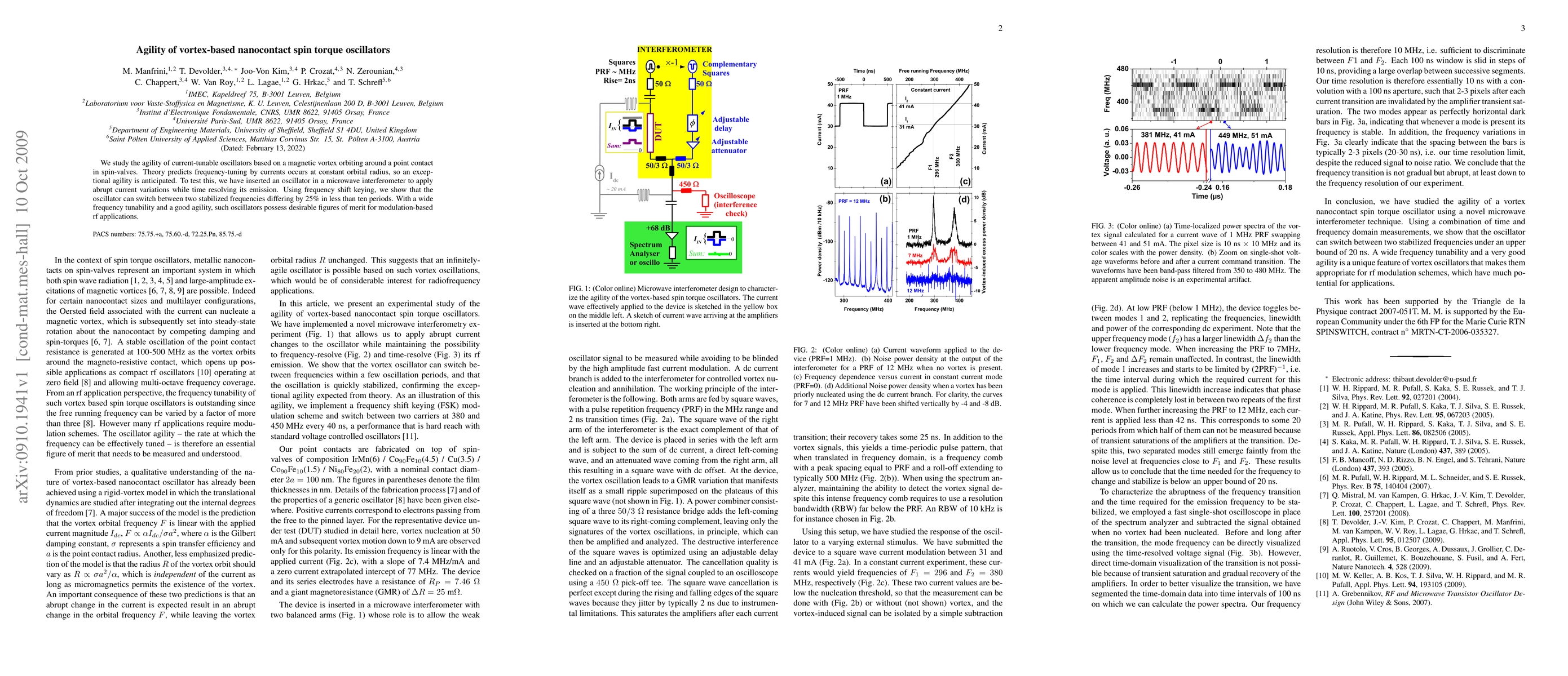 We study the agility of current-tunable oscillators based on a magnetic vortex orbiting around a point contact in spin-valves. Theory predicts frequency-tuning by currents occurs at constant orbital radius, so an exceptional agility is anticipated. To test this, we have inserted an oscillator in a microwave interferometer to apply abrupt current variations while time resolving its emission. Using frequency shift keying, we show that the oscillator can switch between two stabilized frequencies differing by 25% in less than ten periods. With a wide frequency tunability and a good agility, such oscillators possess desirable figures of merit for modulation-based rf applications.