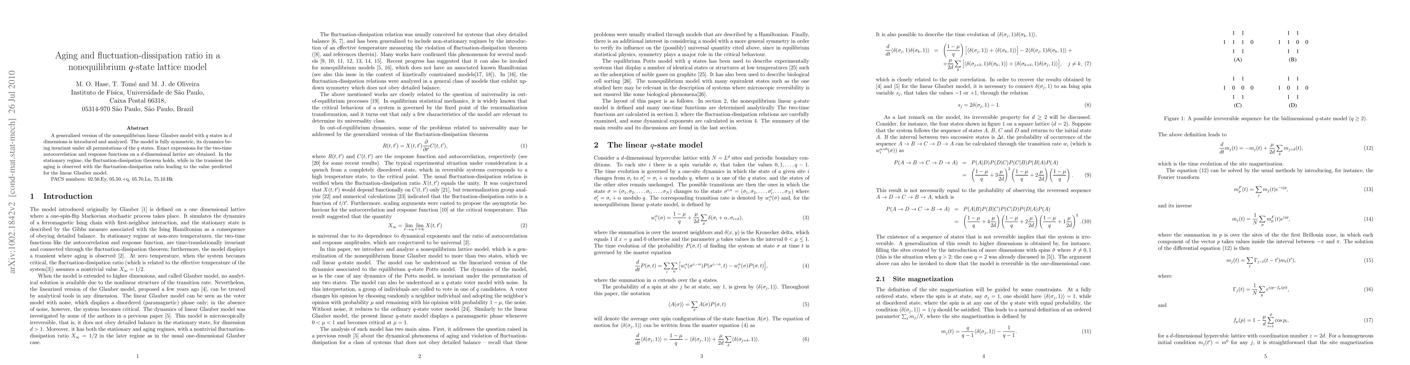 This paper introduces a generalized nonequilibrium $q$-state lattice model, analyzing its dynamics and obtaining exact expressions for autocorrelation and response functions. It shows that while the fluctuation-dissipation theorem applies in the stationary regime, aging effects emerge transiently, aligning with predictions for the linear Glauber model.