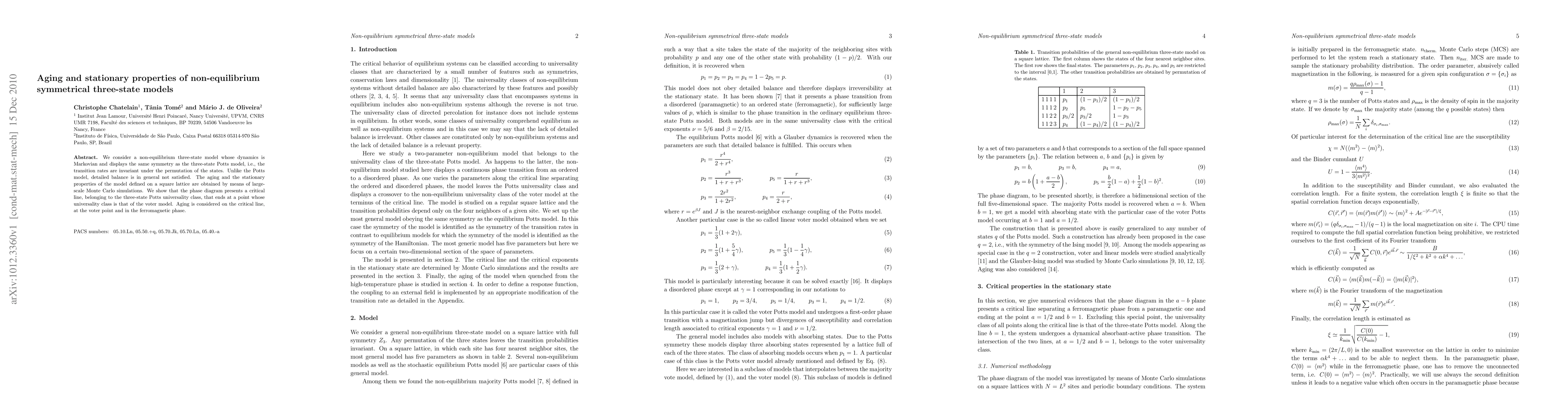 We consider a non-equilibrium three-state model whose dynamics is Markovian and displays the same symmetry as the three-state Potts model, i.e., the transition rates are invariant under the permutation of the states. Unlike the Potts model, detailed balance is in general not satisfied. The aging and the stationary properties of the model defined on a square lattice are obtained by means of large-scale Monte Carlo simulations. We show that the phase diagram presents a critical line, belonging to the three-state Potts universality class, that ends at a point whose universality class is that of the voter model. Aging is considered on the critical line, at the voter point and in the ferromagnetic phase.