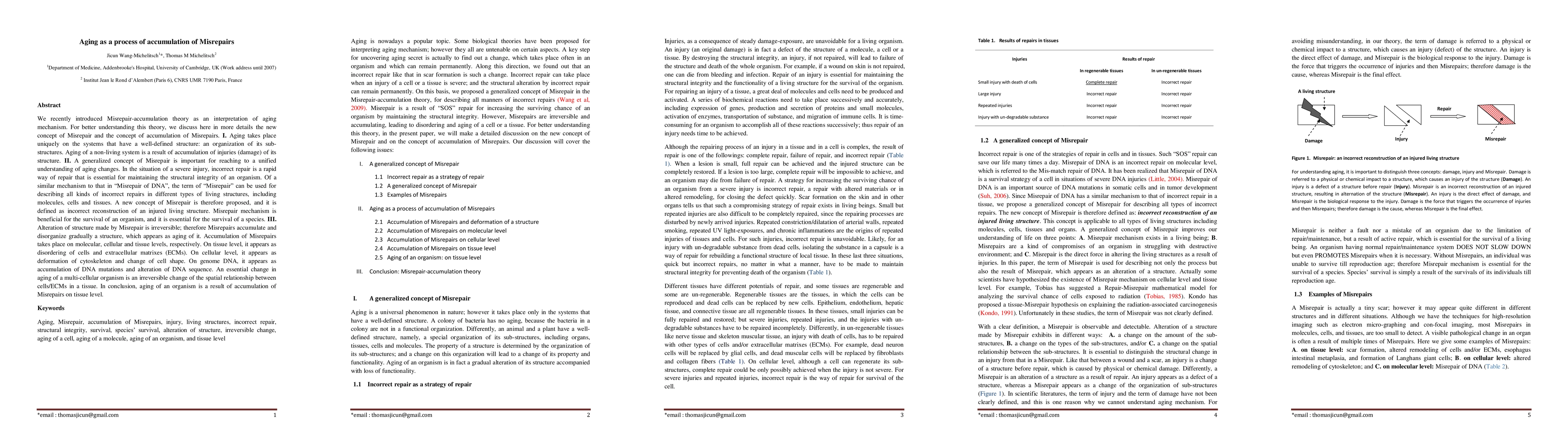 We recently introduced Misrepair-accumulation theory as an interpretation on aging mechanism. For better understanding this theory, we discuss here in more details the new concept of Misrepair and the concept of accumulation of Misrepairs. I. Aging takes place uniquely on the systems that have a well-defined structure: an organization of its sub-structures. Aging of a non-living system is a result of accumulation of injuries (damage) of its structure. II. A generalized concept of Misrepair is important for reaching to a unified understanding of aging changes. In the situation of a severe injury, incorrect repair is a repair essential for maintaining structural integrity for increasing the surviving chance of an organism. With the same mechanism as that in "Misrepair of DNA" , the term of "Misrepair" can be used for describing all kinds of incorrect repairs on different types of living structures, including molecules, cells and tissues. A new concept of Misrepair is therefore proposed and defined as incorrect reconstruction of an injured living structure. Misrepair mechanism is beneficial for the survival of an organism, and it is essential for the survival of a species. III. Alteration of structure made by Misrepair is irreversible; therefore Misrepairs accumulate and disorganize gradually a structure, which appears as aging of it. Accumulation of Misrepairs takes place on molecular, cellular and tissue levels respectively: on tissue level, it appears as disorganization of cells and extracellular matrixes (ECMs); on cellular level, it appears as deformation of cytoskeleton and change of cell shape; and on DNA, it appears as accumulation of DNA mutations and alteration of DNA sequence. An essential change in aging of an organism is an irreversible change of the spatial relationship between cells/ECMs in a tissue. In conclusion, aging of an organism is a result of accumulation of Misrepairs on tissue level.
